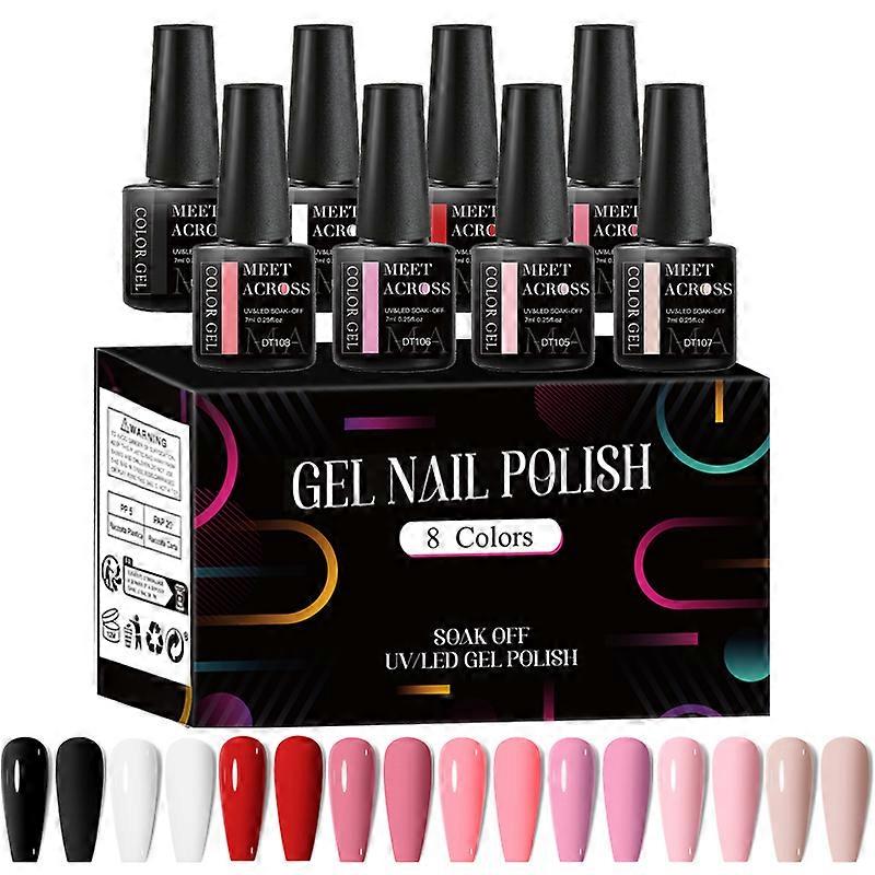[DETAIL] Specification: Brand:MEET ACROSS Quantity:8Pcs/Set Volume:Approx.7ml Curing Tools:UV Lamp or LED Lamp Long Period: About 15-28 Days Package Contents: MEET ACROSS 8Pcs/Set 7ml Colorful Gel with Box Feature: It is made of healthy, environmental, friendly materials. It is quick-drying with any UV Light. This nail gel is easy to apply and soak off. Allow you for professional or home nail art design. A professional Nail Art Gift for yourself or your girlfriend. Professional usage: Step 1. Clean Nails then trimming nail surface as normal manicures process. Step 2. Fully shake up the gel polish, it can make the gel polish color balanced. (Important) Step 3. Apply base gel first,which can make polish lasting longer, cure with UV lamp or LED lamp. (Necessary) Step 4. Apply first layer of color gel directly, cure with UV lamp for 2 minutes or cure with LED lamp for 60 seconds. Step 5. Apply second layer of color gel and then immediately cure with UV lamp for 2 minutes or cure with LED lamp for 60 seconds. Step 6. Coat with top coat,cured by UV lamp or LED lamp. Remove Our UV Gel Nail Polish Step: • Soak nails in a glass bowl filled with a small amount of acetone, or wrap each nail in cotton pad soaked with acetone for around 5 to 10 minutes. • Product will start to become soft and you can gently file it away or slide it off using a small wooden stick. Warm Reminder: *KEEP OUT OF REACH OF CHILDREN . *Avoid touching the ears, nose, mouth, eyes and other parts, as well as sensitive skin, skin with wounds or allergic skin. If accidentally touched, it is recommended to wash immediately with water. *Store in a cool place.Keep out of sunlight or extreme exposure to LED or UV light. *If redness or other signs of adverse reaction occur, discontinue use immediately . [ATTRIBUTES] - Is Batteries Included: No - High-concerned chemical: None - Quantity: 8pcs - Is Batteries Included: No - High-concerned chemical: None - Quantity: 8pcs - Size: 7ml - Material: Plastic - Brand Name: MEET ACROSS - Origin: Mainland China - Item Type: Set & Kit