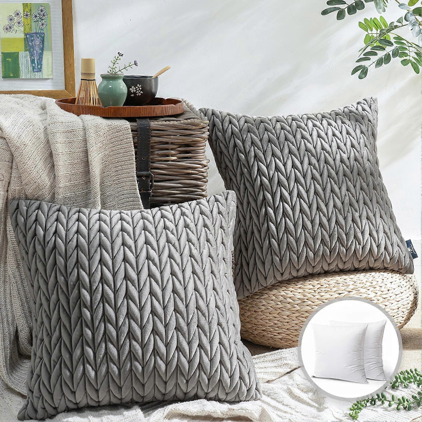 Phantoscope Quilted Velvet Braid Textured Pleated Decorative Throw Pillow, 20" X 20", Dark Gray, 2 Pack