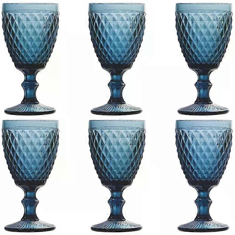 Blue Wine Glasses set of 6 Colored Drinking Goblets Vintage Embossed Glassware 10oz Pretty Water Stemmed Cup Wedding Party Bar