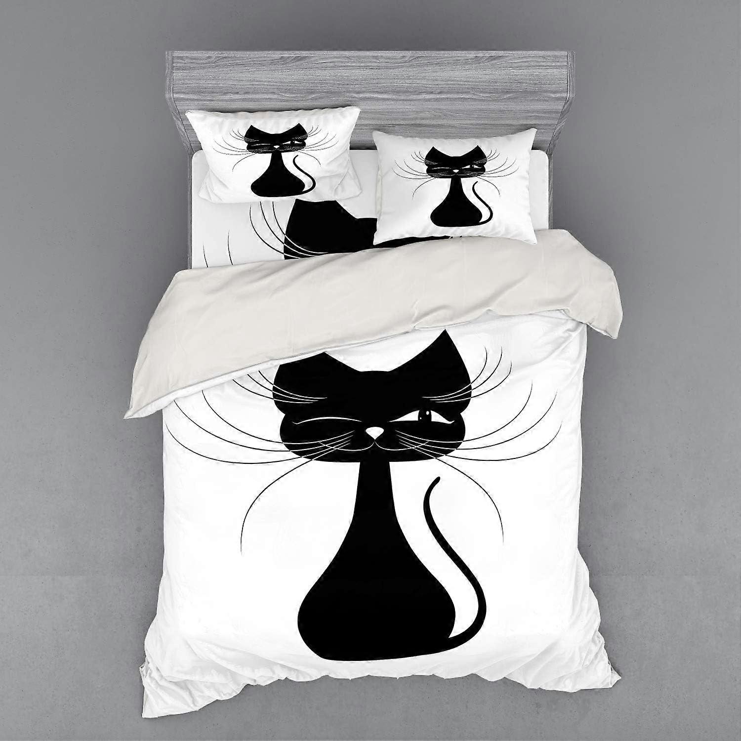 Halloween Cat Duvet Cover Set, Monochromatic Graphic of Silhouette Style Illustrated Black Kitten Print, 3 Pieces, Black and White