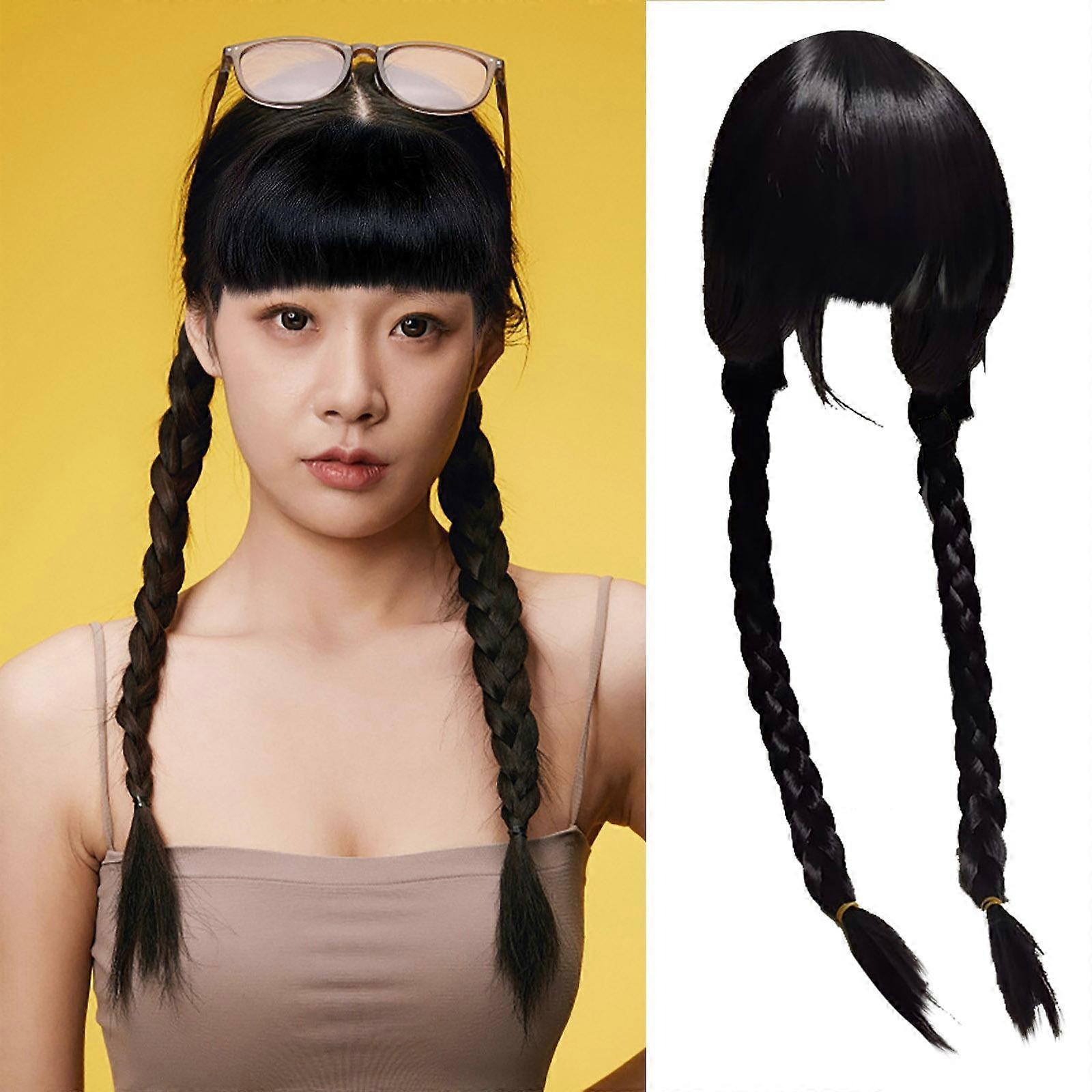 GARENAS Braided Wigs for Black Women Wig Wig Black Double Ponytail Wig Wig Wig with Fringe for Adults Teens Women Girls Long Wig with Fringes