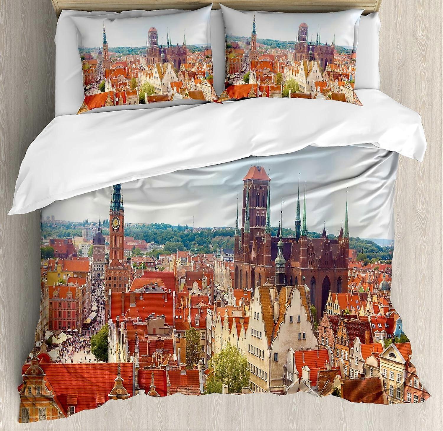 European Duvet Cover Set, Cityscape of Nostalgic Town Antique Polish City with Castle Tower, 3-Piece Bedding Set with 2 Pillowcases, Red Brown