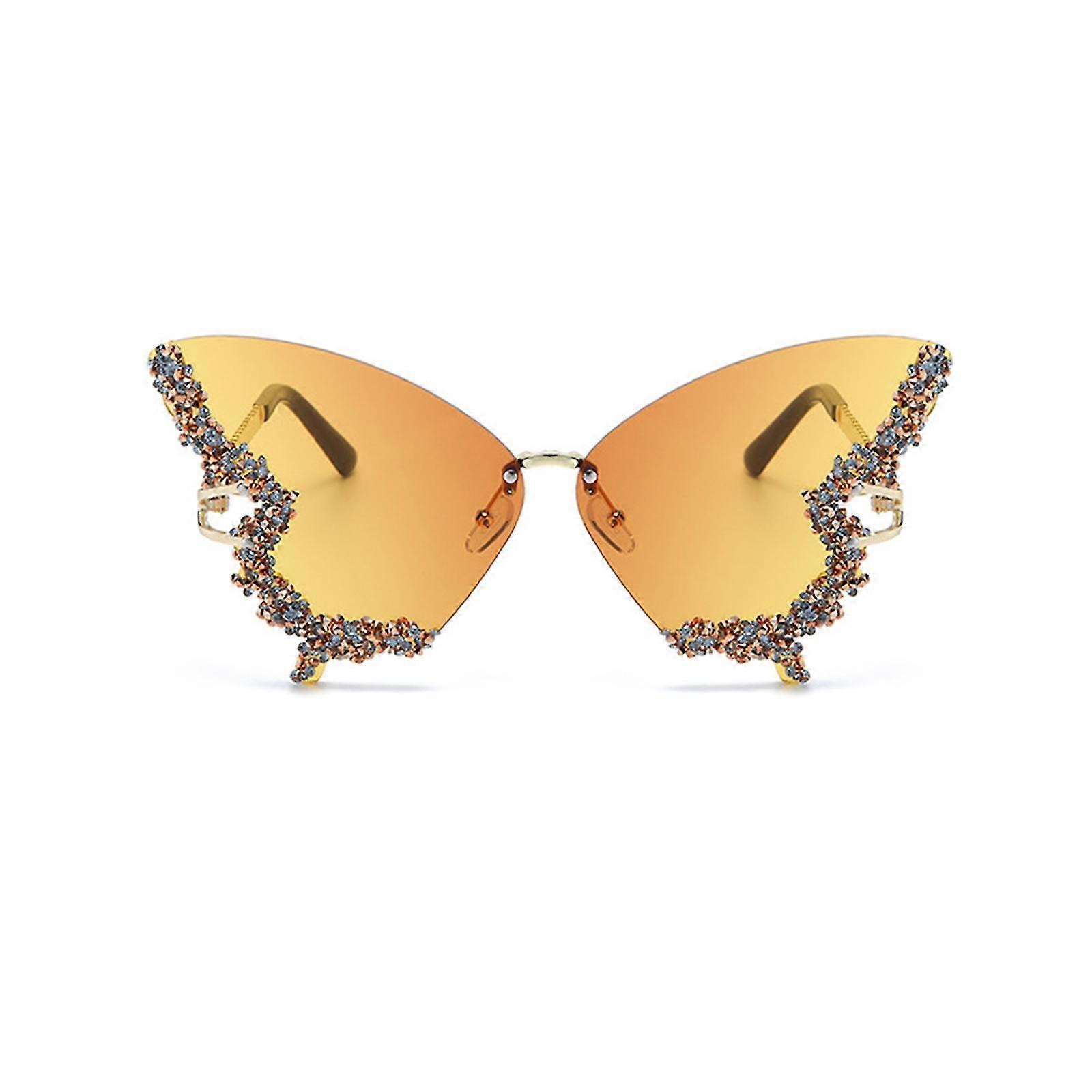 Luxury Diamond Butterfly Sunglasses Women Vintage Rimless Oversized Rhinestone bling Sun Glasses--Yellow
