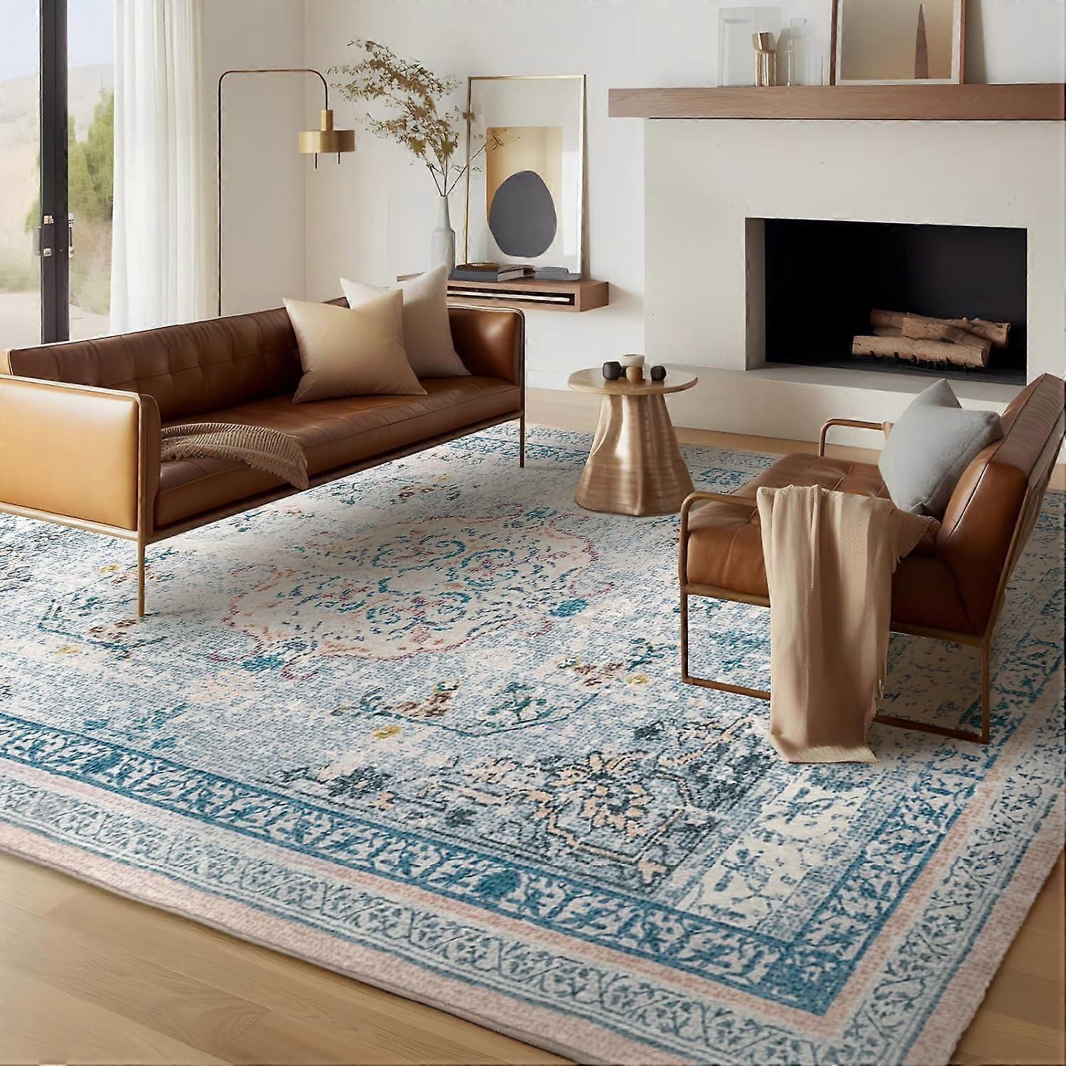 Vintage Boho Area Rugs for Living Room, Machine Washable with Non-Slip Backing, Indoor Blue Rug Decor, 3 x 5 ft, 1 Pack