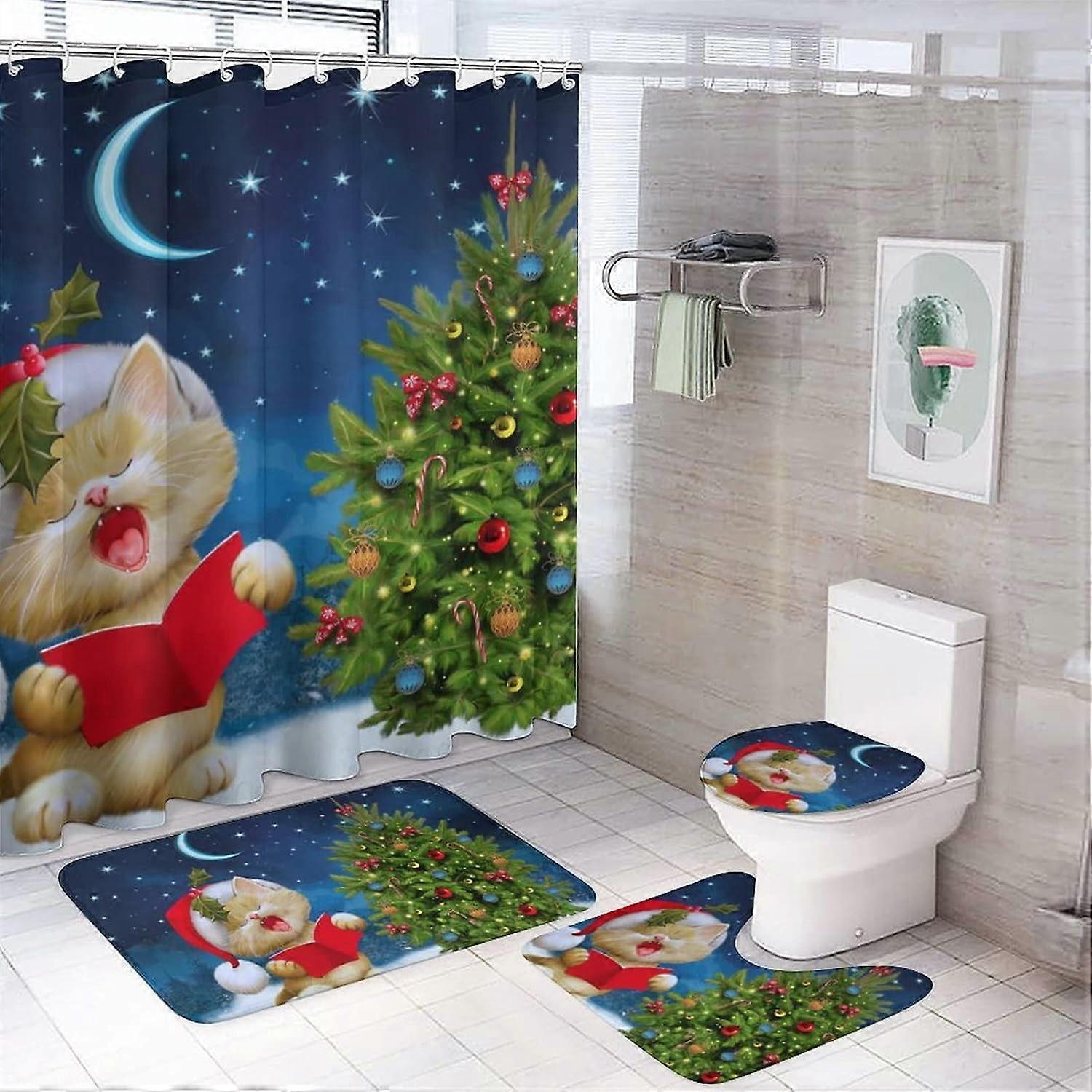 4 Pcs Christmas Wood Grain Shower Curtain Set with Non-Slip Rug, Toilet Cover & Bath Mat, Durable Waterproof Xmas Decor, 71" x 71"