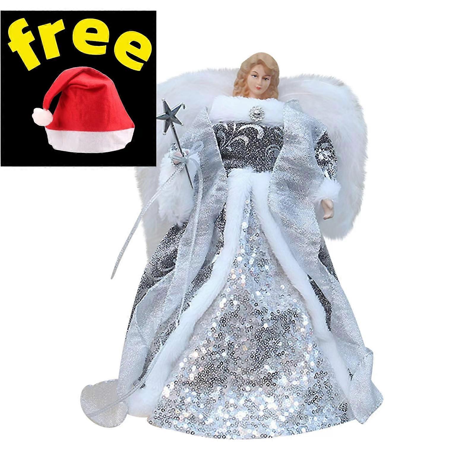 Comefolife 12" Angel Tree Topper w/ White Feather Wings, Luxury Champagne Dress, Flying Angel Figurine Holiday Ornament, Silver