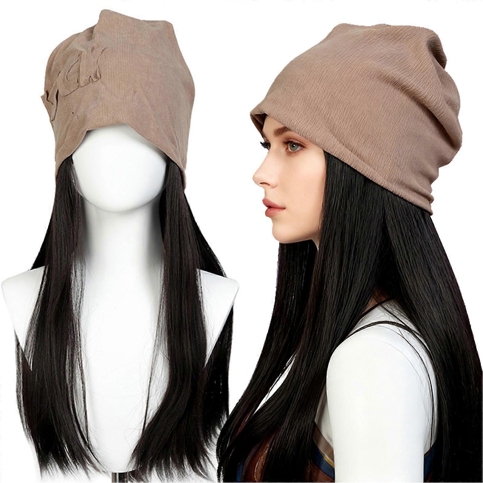 Grey Long Straight Hair Beanie Hat 16 Inch Heat Resistant Fiber Integrated Wig