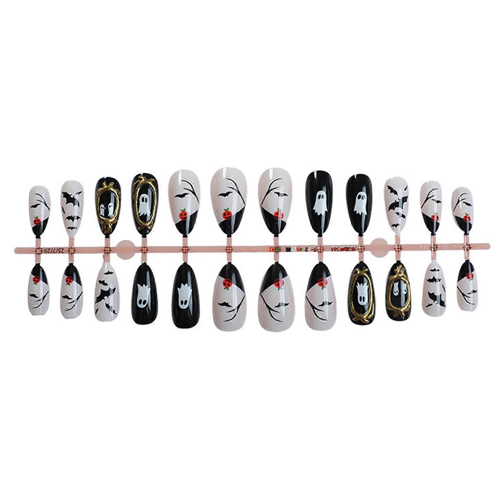24Pcs Almond Shape Press On Nails With Gold Foil Design Halloween Ghost Bat