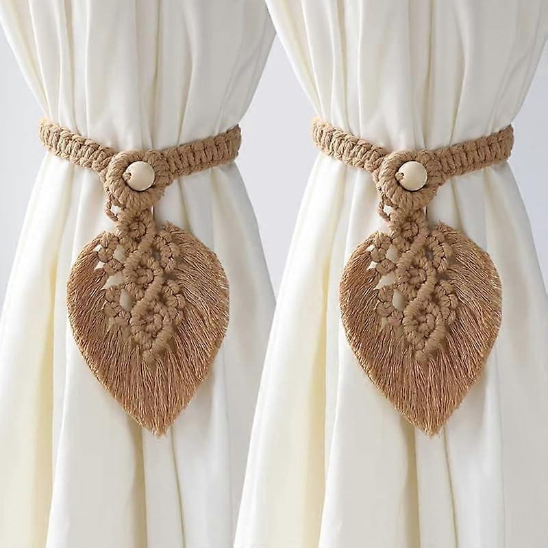 2 Pack Boho Curtain Tiebacks, Hand Knitting Cotton with Adjustable Wooden Bead Rope, Bohemian Drapery Holdback Decor