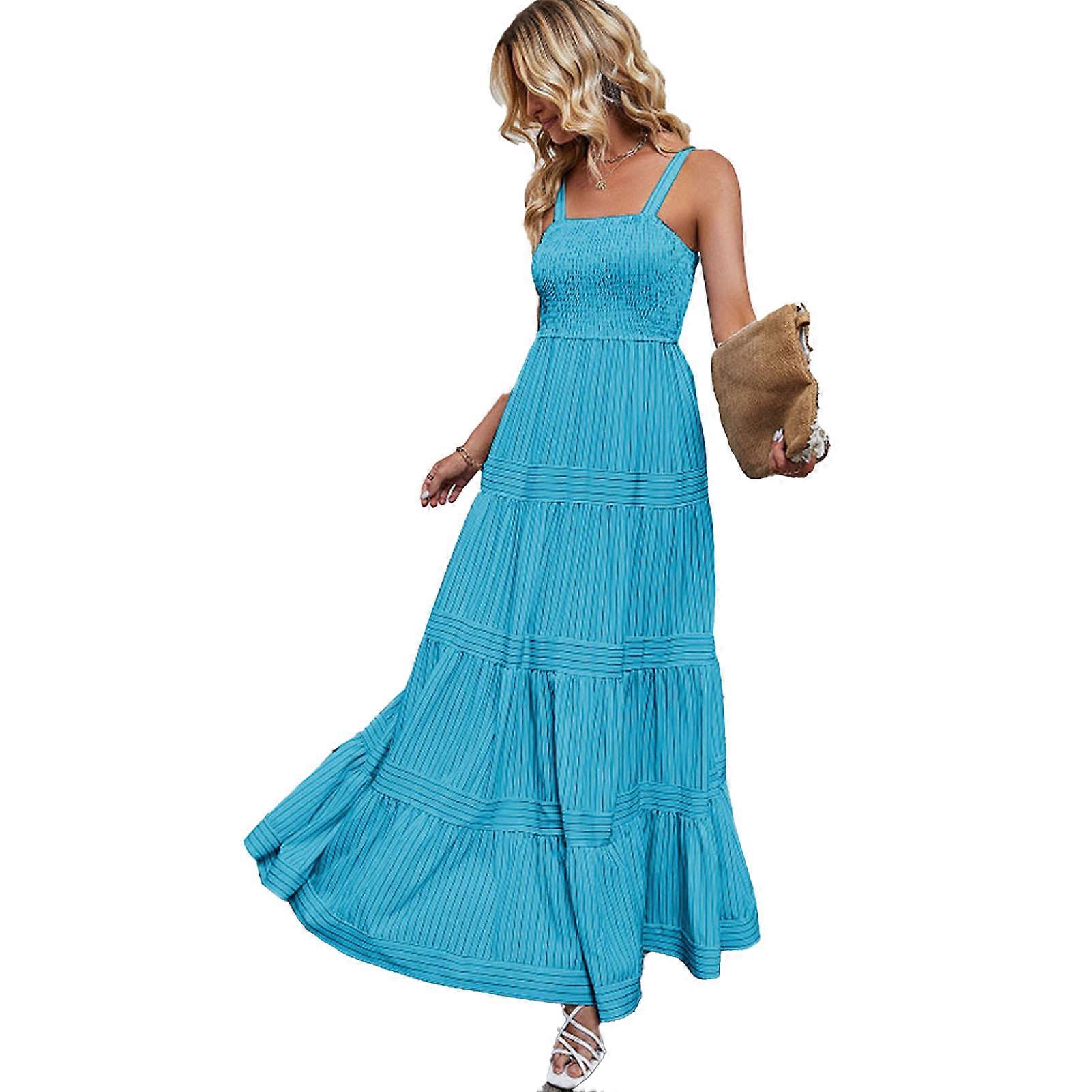 Women Shirred Striped Long Sleeveless Waist Slimming Ruffle Hem Spaghetti Strap Stylish Stripe Dress
