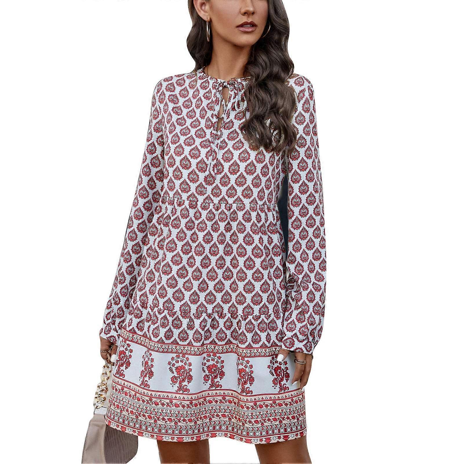 Womens Fall Dress Lace Up Crew Neck Long Sleeve Printed Hollow Short Dress for Dating Work