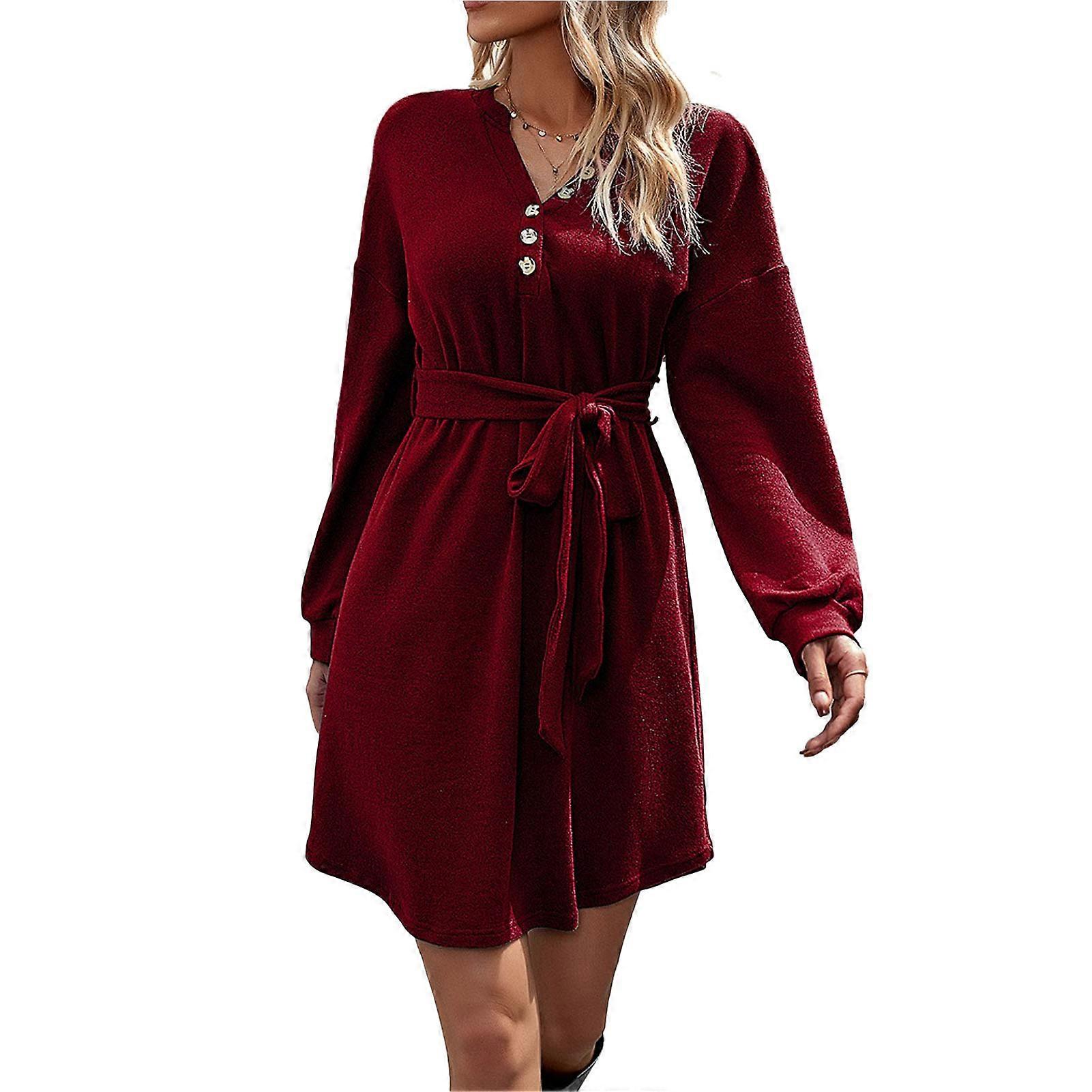 Women V Neck Belted Waist Button Decoration Fashion Comfortable Loose Long Sleeve Dress for Dating Party