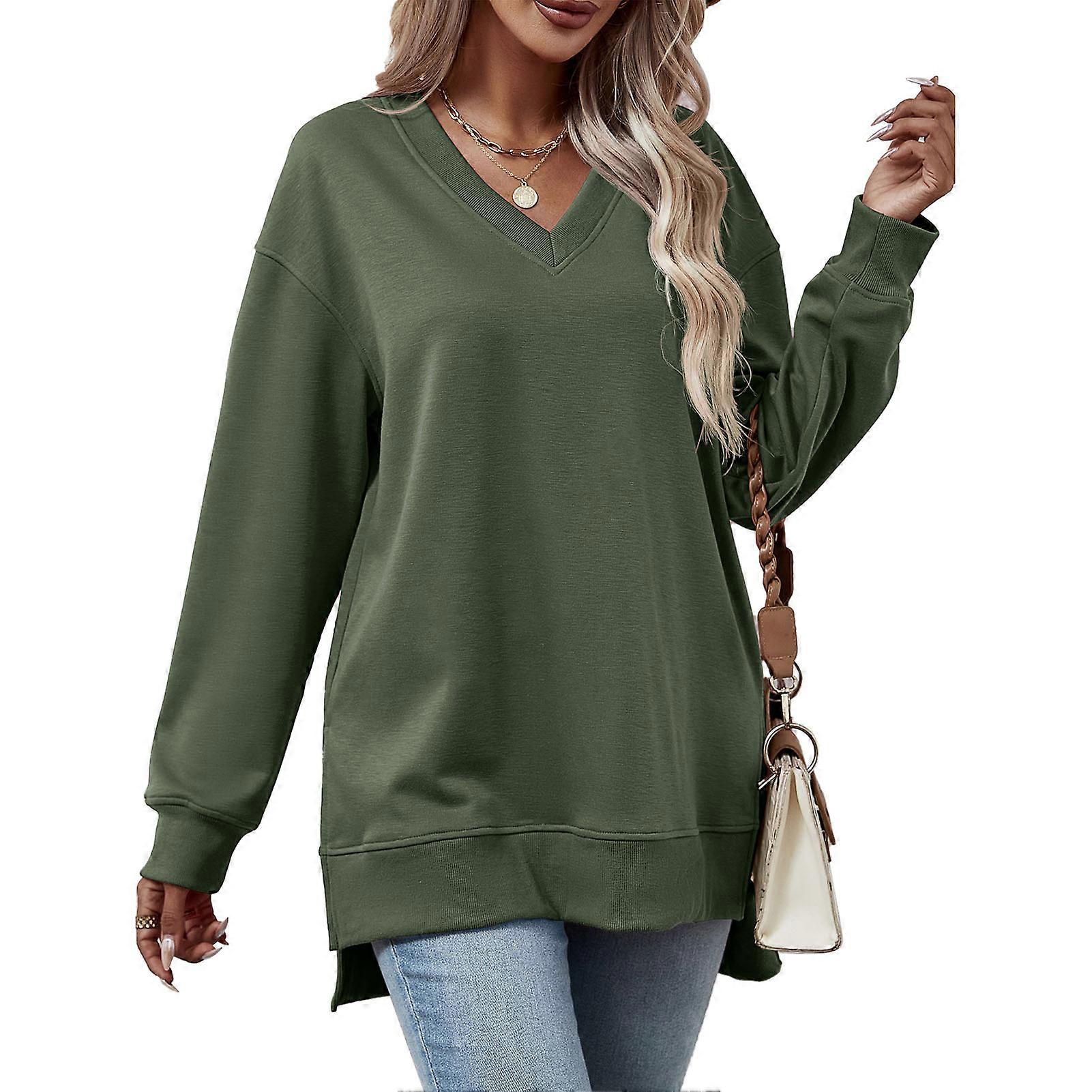 Women Long Sleeves Sweatshirt V Collar Loose Fitting Split Hem Pure Color Casual Pullover Top for Daily Wear