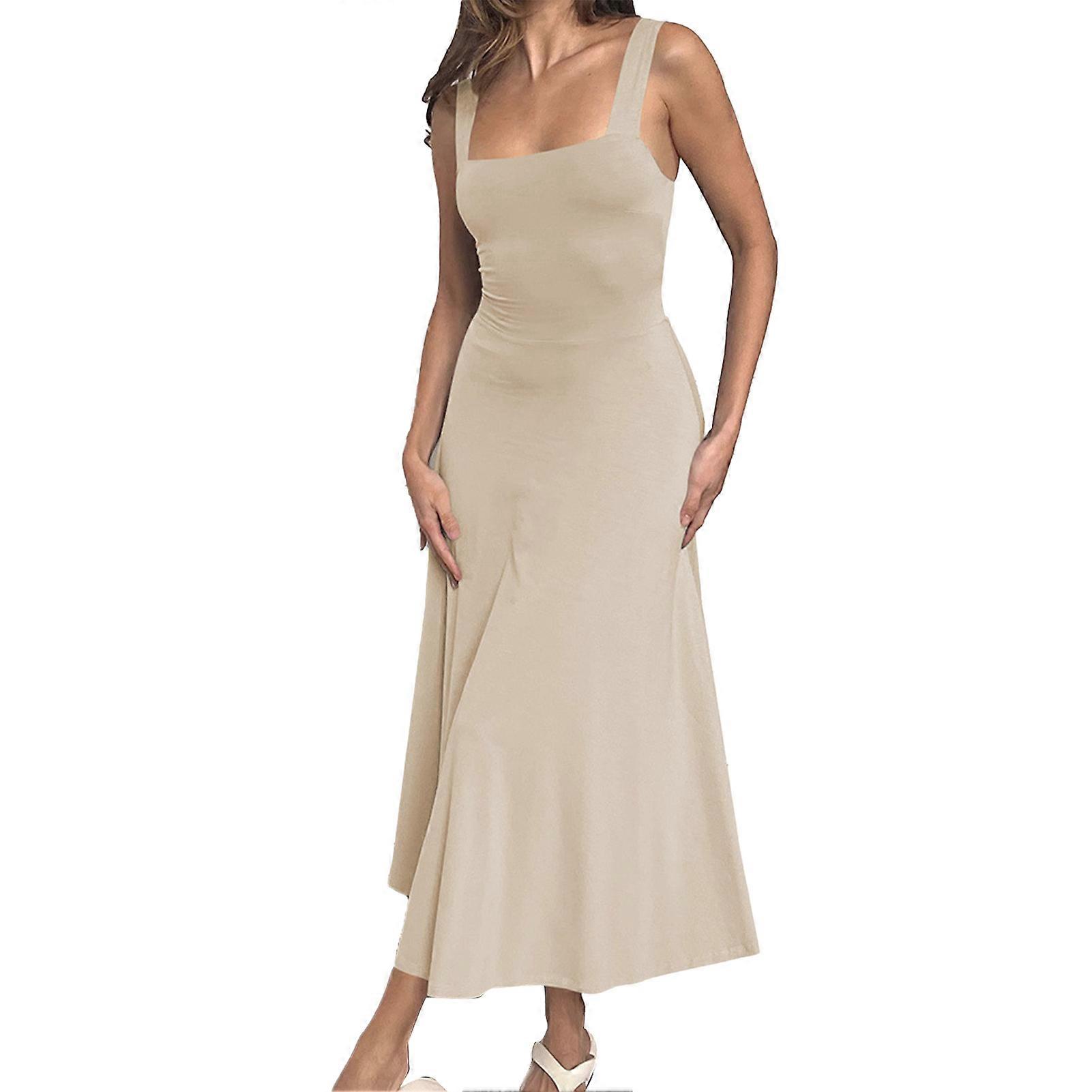 Women A Line Long Solid Low Cut Sleeveless Back Cross Tie Waist Slimming Stylish Pure Color Flowy Dress