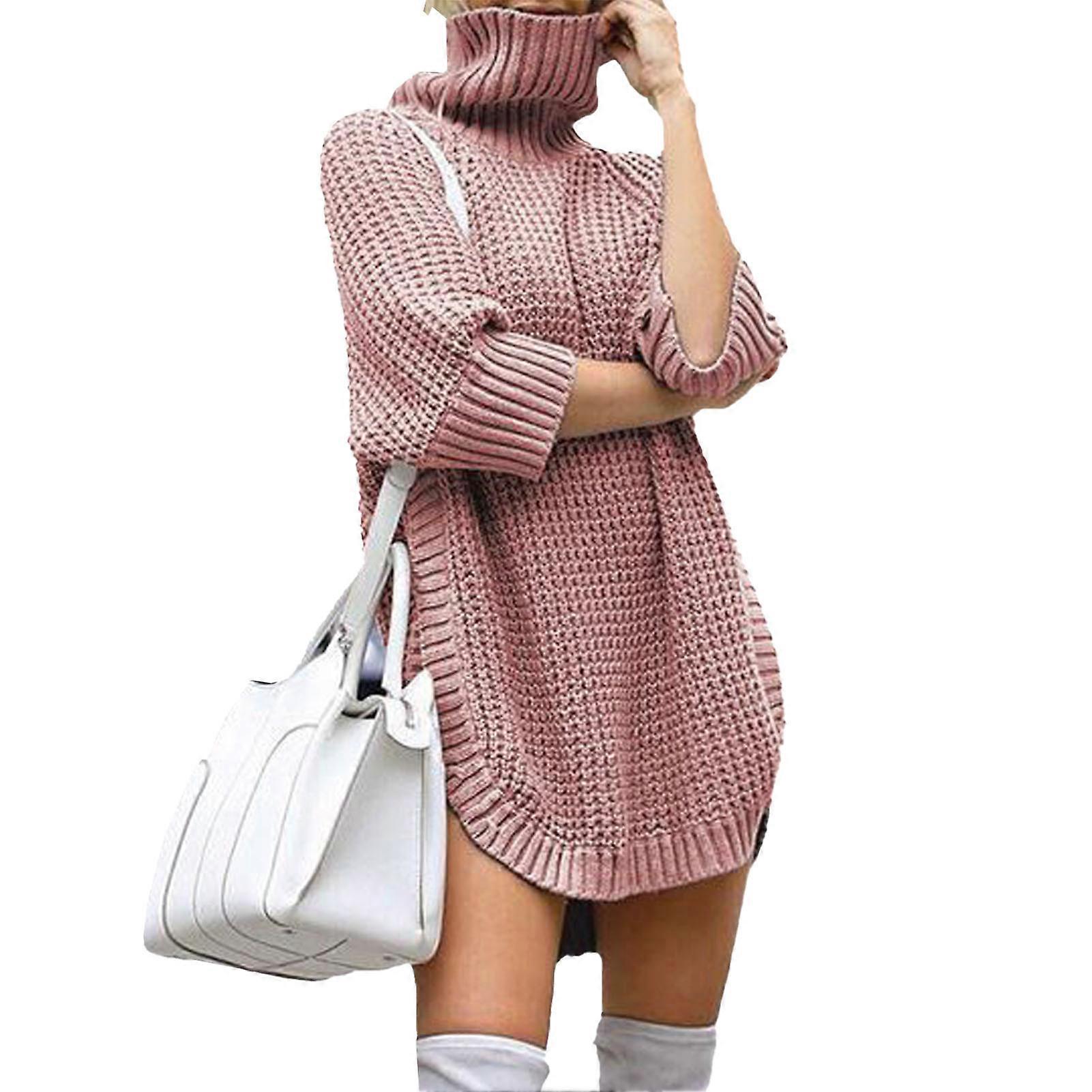 Women Long Turtleneck Sweater Casual Loose Solid Color Split Knitted Female Clothes