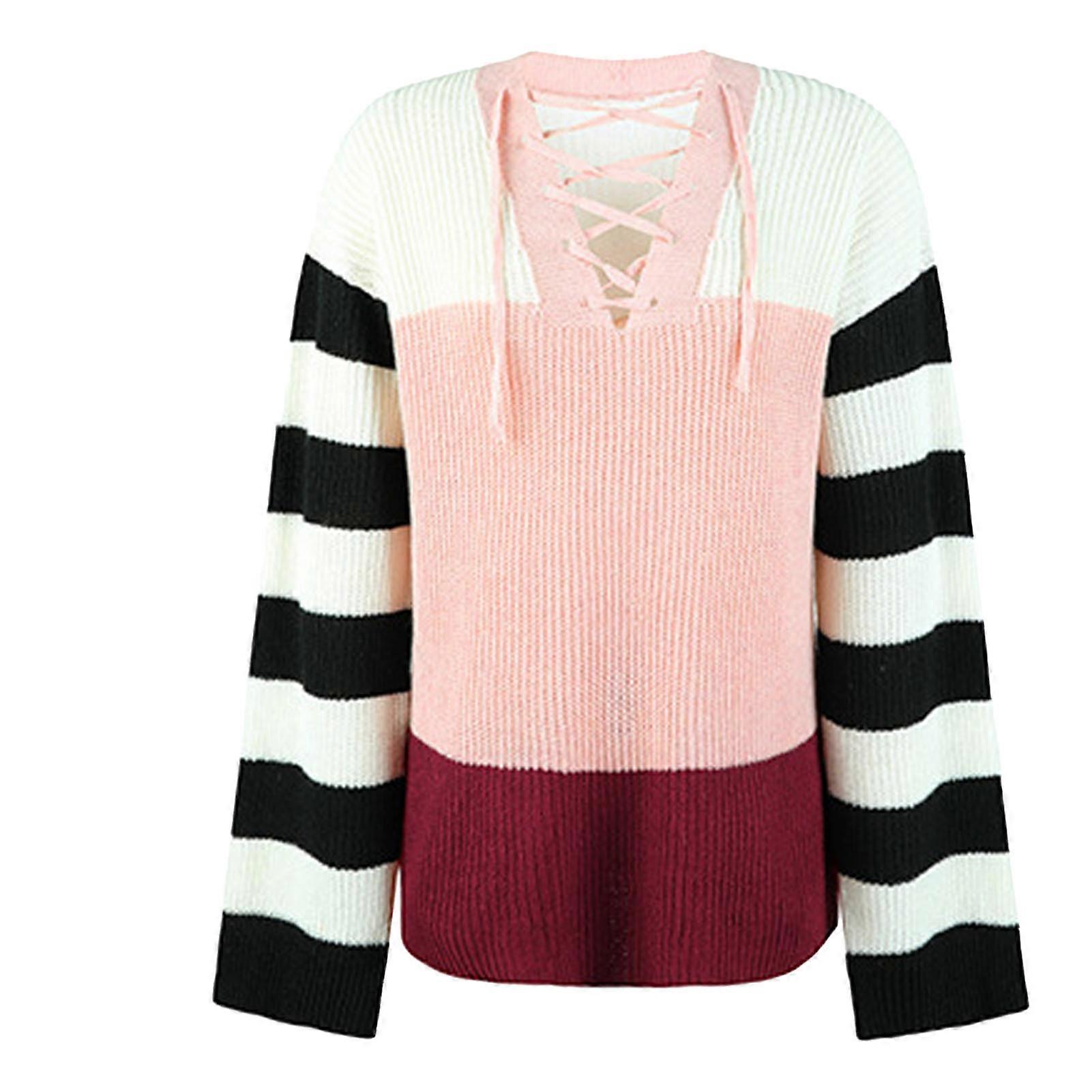 Women Color Block Loose Stripe Lace Up Front V Neck Top Long Sleeve Pullover Casual Knit Sweater
