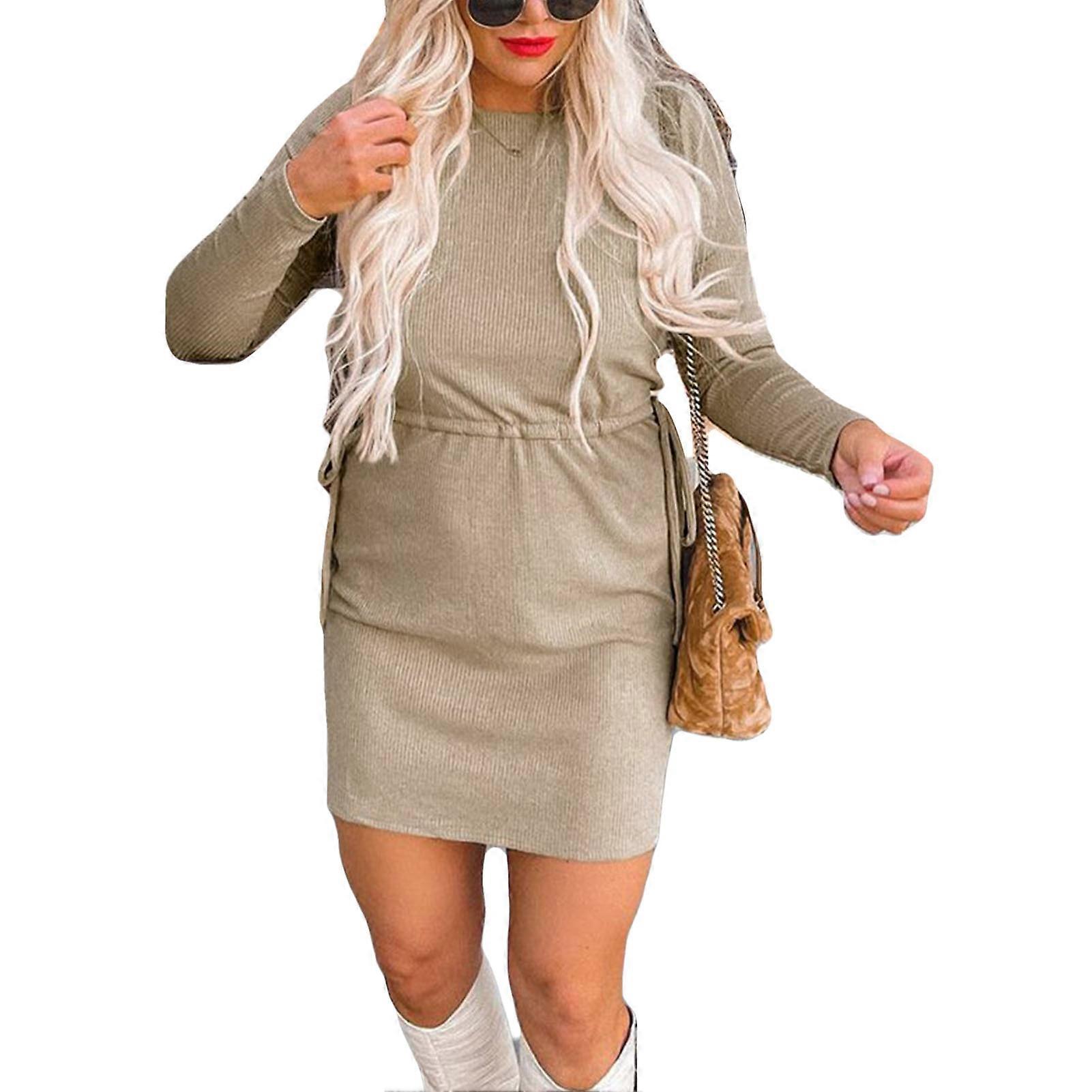 Women Long Sleeve Dress Crewneck Tie Waist Stylish Dress for Office Dating Work Home