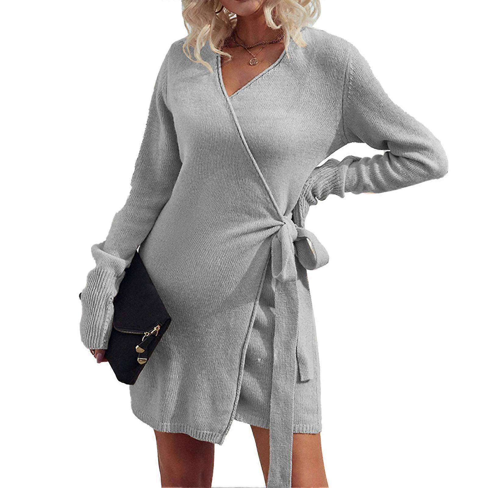 Long Sleeve Wrap V Neck Short Knit Women Fashionable Elegant Plain Color Tie Side Sweater Dress