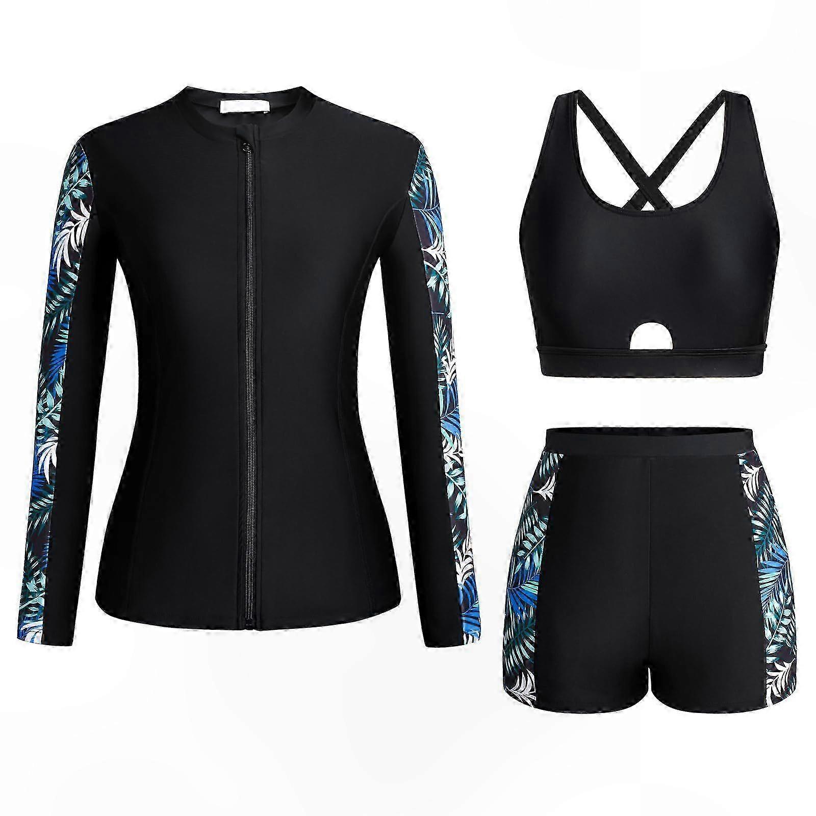 3-Piece Women's Long Sleeve Swimsuit Set: Sports Bra & Trunks, Black Floral XXL