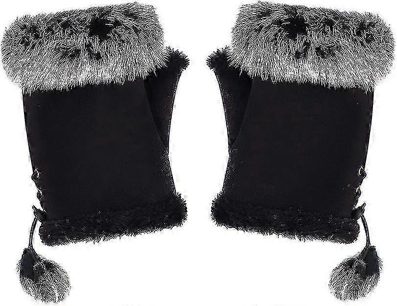 Women's Winter Faux Fur Leather Half Finger and Fingerless Gloves, Warm Fleece Lined Wrist Warmer Mittens for Touchscreen use