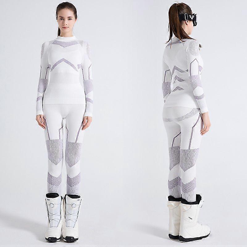 This professional ski base layer set utilizes high-performance athletic fabric specifically engineered for extreme cold conditions The core thermal technology employs special fiber structure to trap air layers, creating effective insulation barriers that maintain warmth even in sub-zero temperatures. Advanced moisture-wicking system rapidly pulls sweat away from skin surface and facilitates quick evaporation to prevent chill and discomfort Compression feature provides optimal muscle support, helping reduce exercise fatigue and enhance recovery. Four-way stretch fabric ensures complete freedom of movement, accommodating everything from sharp ski turns to climbing motions during mountaineering Thoughtfully designed flatlock seam construction minimizes skin irritation, allowing comfortable wear during extended activities. Available in both Black Gold and White Purple stylish color options, the professional appearance suits both athletic and casual wear scenarios This versatile activewear set is not only perfect for skiing but also ideal for various outdoor activities including mountaineering, hiking, fitness training, and running. Precise sizing with S/M/L options accommodates most female body types with excellent fit