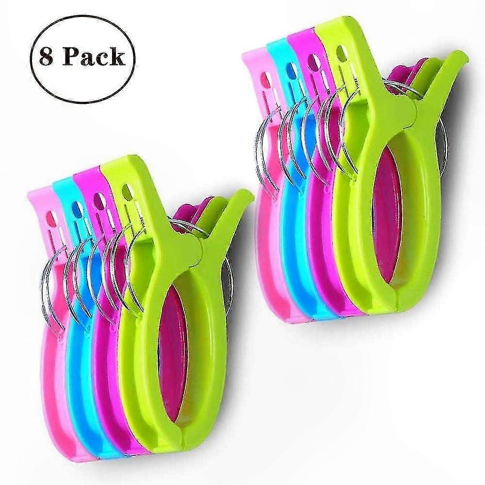 8 Pack Bright Color Jumbo Beach Towel Clips for Beach Chairs or Lounge Chairs - Keeps Towels Secure and Prevents Them from Blowing Away Material: Double Thickness Durable Plastic with Zinc Galvanized Steel Quantity: 8 Pieces Colors May Vary: Blue, Rose Red, Green, Pink, White Size: 6.3 inches (L) x 3.5 inches (W) Weight: 38.7 grams per piece Ideal for Holding Towels in Place on Beach or Lounge Chairs Without Folding