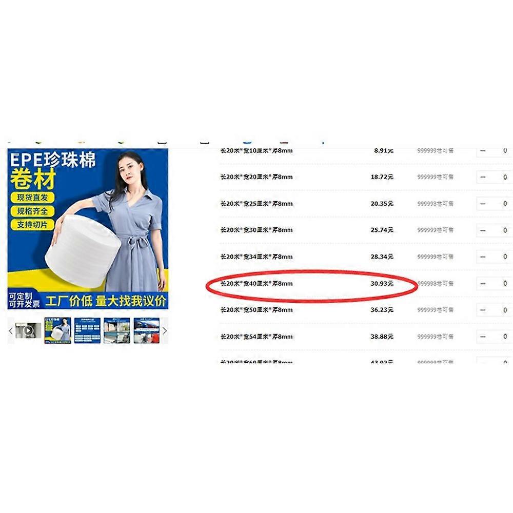 Material: 8MM pearl cotton sheet, padded with cardboard box buffer cotton, length: 20m * width: 40cm * thickness: 8mm