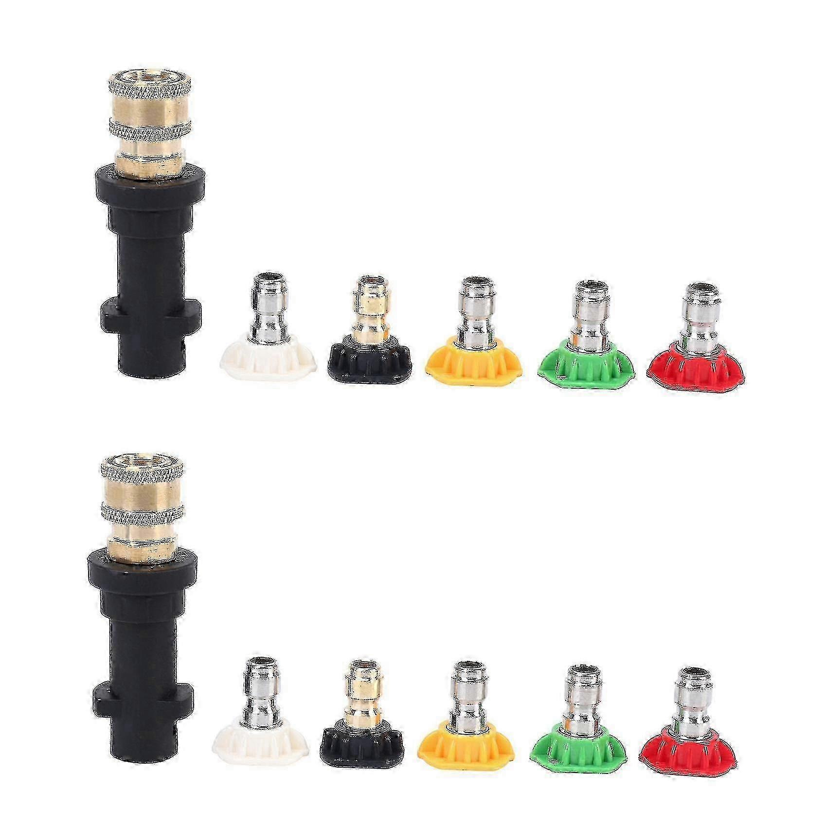 Model: pressure washer gun adapter only fits Karcher K2 K3 K4 K5 K6 K7, female quick connector fitting and spray nozzle only fitting 1/4 inch connector, please pay attention to the size becompatible withe connectingComplete set: different color power washer nozzle represent different angles, red 0, yellow 15, green 25, white 40, black 65High efficiency: adapter connects to quick connector female plug and female plug connect to pressure washer nozzles, different spray angle make it easy to clean hard-to-reach areas quickly and efcompatible withtlessWorking environment: working pressure is up to 2000 PSI; Working temperature is up to 140 Material: gun adapter and quick connector fitting made of brass and rubber, washer spray tip made of brass and stainless steel, exquisite workmanship, not easy to corrode and fadeColor: MulticolorMaterial: rubber, brass, stainless steelPackage Contents:2 x Pressure washer gun adapter2 x 1/4 Inch brass female quick connector fitting10 x 1/4 Inch washer spray tipsOnly the above package content, other products are not included.Note: Light shooting and different displays may cause the color of the item in the picture a little different from the real thing. The measurement allowed error is 1-3cm. Note: Due to the light and screen setting difference, the item's color may be slightly different from the pictures. Please allow slight dimension difference due to different manual measurement.