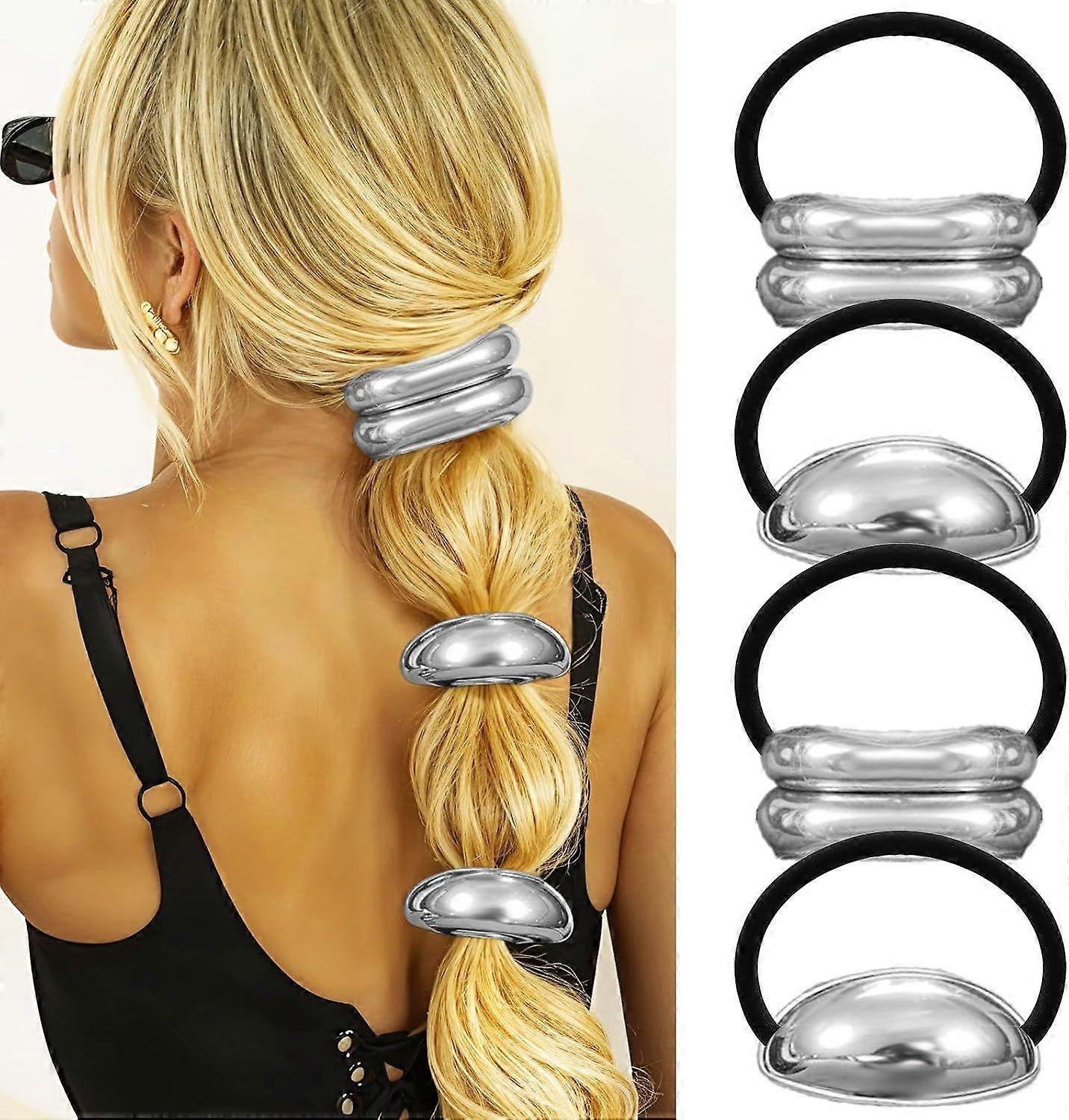 Metal Hair Ties 4 PCS Metal Gold Hair Cuffs for Ponytails Geometric Elastic Ties Accessories Glossy Arch Wrap Women(Silver)
