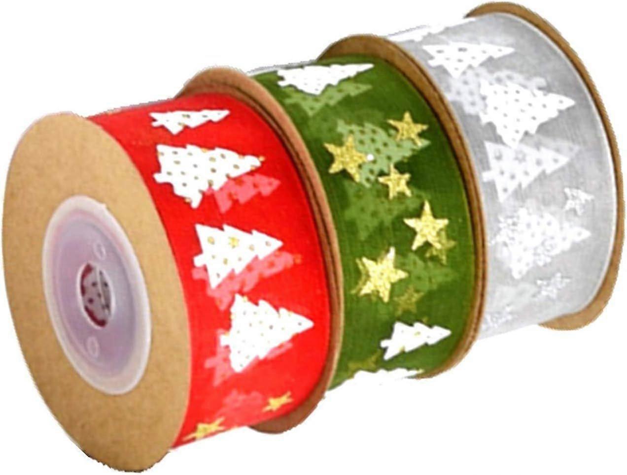 3 Rolls Christmas Organza Satin Ribbon with Xmas Tree Star Pattern Total 15 Meters (25 mm Wide) Gift Wrapping Ribbon for Xmas Gift Box Candy Bags Pack