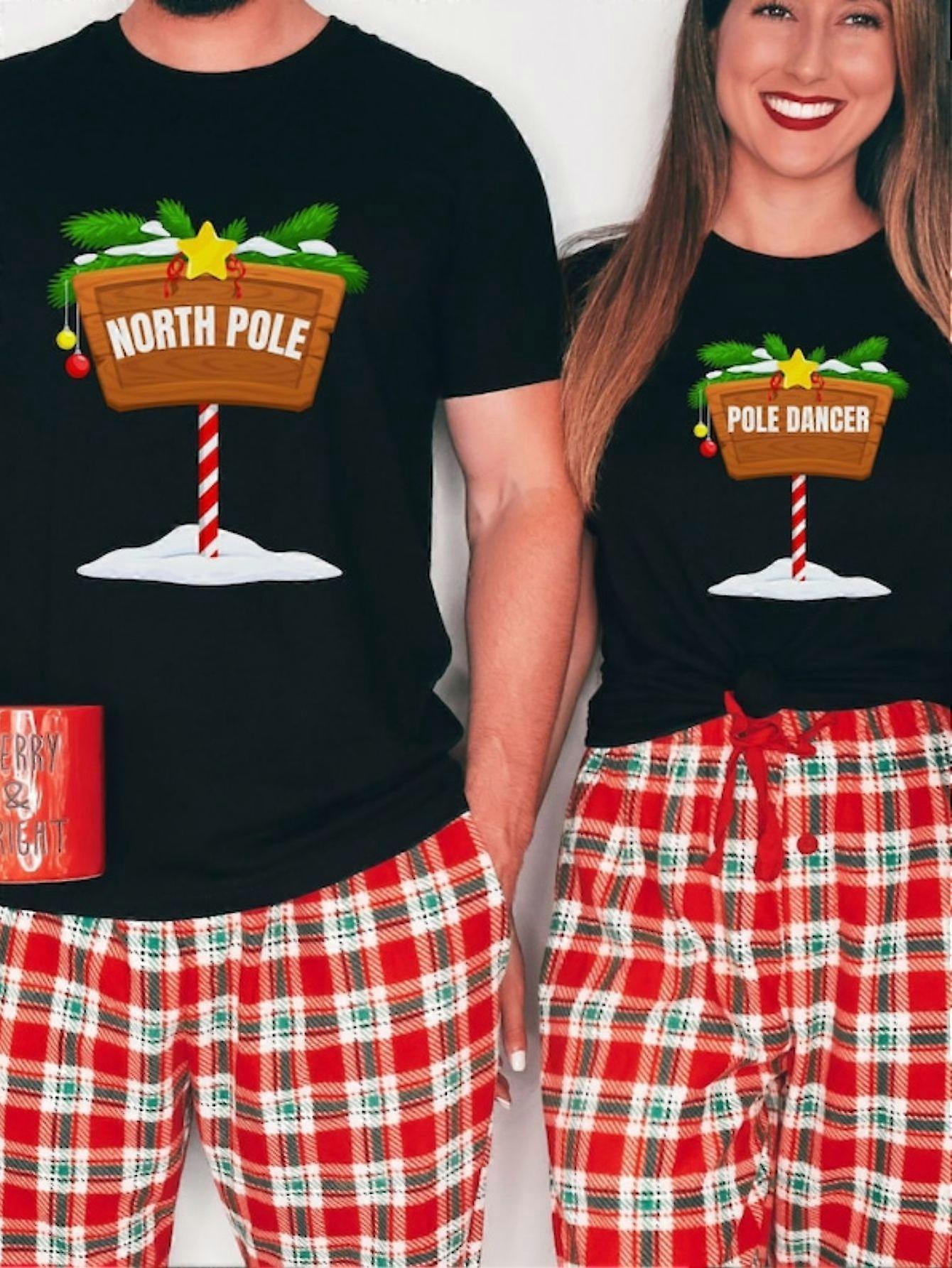 Cozy 100% Cotton Couples' Christmas Pajama Set - Funny Heat Transfer Print, Short Sleeve & Round Neck T-Shirts for Men a