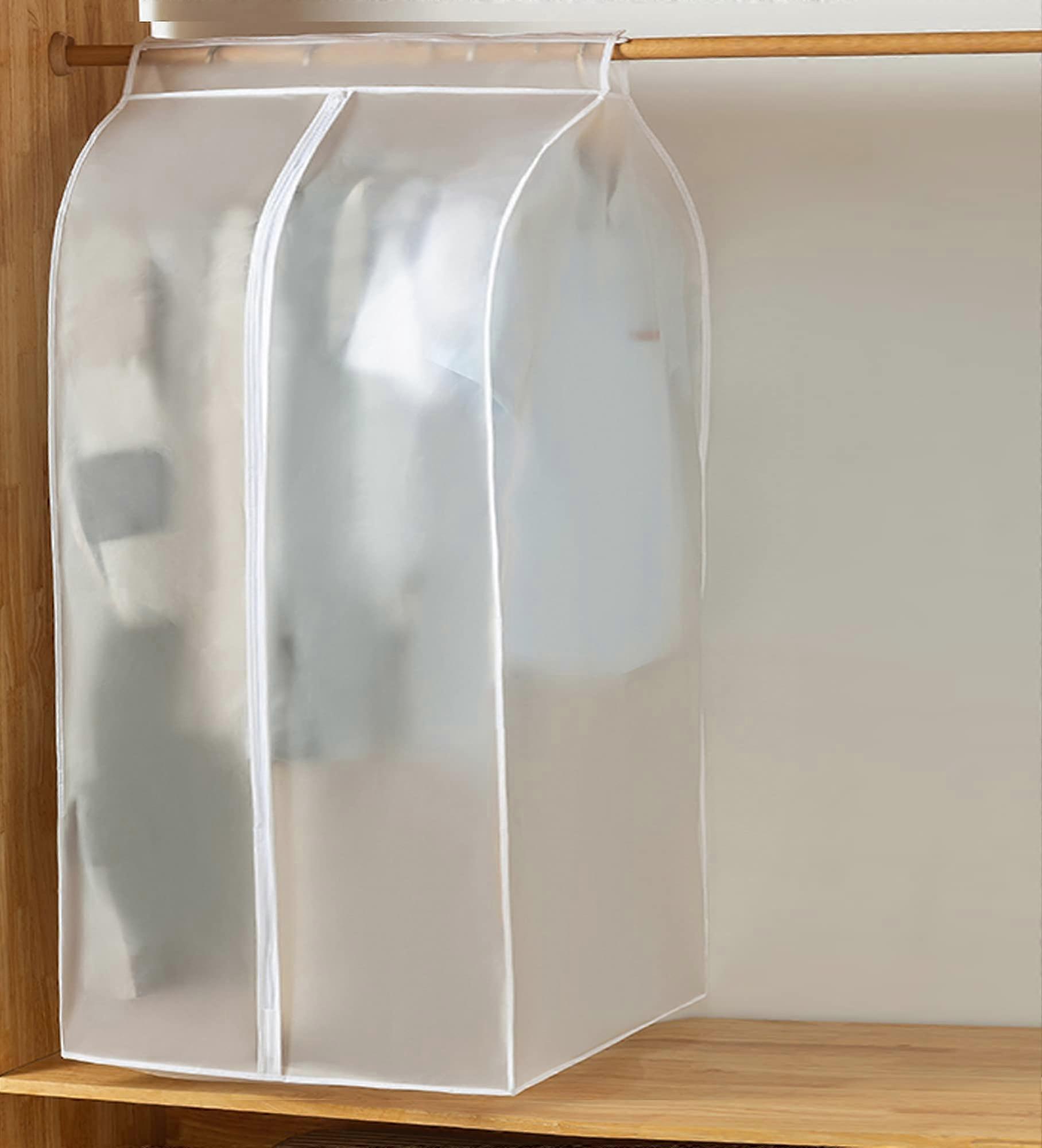 HIGH QUALITY MATERIAL - Our clothes dustproof cover is made of PEVA, moisture and water resistant. Durable, anti-static, reusable and easy to clean, breathable, will not fade and will protect your clothes from dust. DURABLE ZIPPER + MAGIC TAPE - The garment cloth bag with a widened whole magic tape design and bottom stitching, making it more dust and water resistant. Smooth double zips make it easy to remove and hang clothes. The zipper closure protects the contents from dust and flying insects CLEAR DESIGN - The clear design makes it easy to find the clothes you want quickly and easily. Easily identifies which clothes are inside, making it easier to sort clothes and keep them fresh, clean and wrinkle-free. Garment bag for storage is ideal for storing clothes or for travel use. WIDE RANGE OF USES - This hanging clothes bags are perfect for larger coats, suits, jackets, shirts, dresses, tuxedos, women's shirts or other clothing, jackets, trousers, etc. Protect your clothes from dust and pet hair. Keeps your wardrobe more organized. EASY TO INSTALL - The clothes cover protector can be hung on standard wardrobe rod, double hangers, shelves, wardrobe storage box, clothes rod, clothes pole, wardrobe or clothes rack for long time storage. You can easily install it in minutes without having to remove it from the closet or clothes rod.
