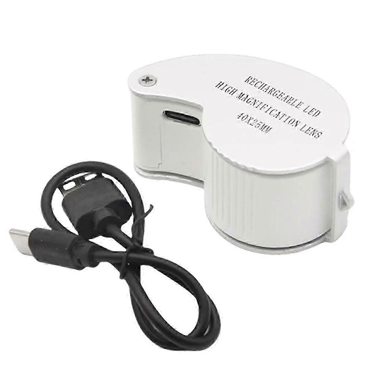 Convenient LED Lighting: The magnifying loupe features bright white LED lights that illuminate your workspace brilliantly, controlled with an easy-to-use switch, providing optimal visibility for detailed tasks. High Magnification Power: With exceptional magnification, this jewelers loupe magnifier is perfect for exploring intricate details, making it ideal for precision work in jewelry and watch repairs. Foldable and Portable Design: This pocket folding jewelers loupe is compact and foldable, allowing you to easily carry it in your pocket and use it anytime, anywhere. Versatile Applications: Suitable for examining jewelry, coins, stamps, and antiques, this eye loupe jewelers magnifier enhances the viewing experience for various hobbies. Premium Optical Lens: Crafted with high-quality lenses, this illuminated jewelry loop magnifier ensures a clear and distortion-free view, facilitating accurate inspections. With UV lamp - 6 LED white lamps + 3 UV UV lamps Magnification: 40 times Lens size: 25mm Battery specification: 90mAh, 3.7V Product size: about 100.00x33.00x27.00mm/3.94x1.3x1.06inch Style: Handheld Light source: LED lamp With light: With light Color: White Material: Aluminum Plastic Package Contents: 1 * Foldable Magnifier 1 * Storage Bag 1 * Charging Cable 1 * English and Chinese instruction manual Only the above package content, other products are not included. Note: Light reflection and different displays may cause the color of the item in the picture a little different from the real thing. The measurement allowed error is +/- 1-3cm.