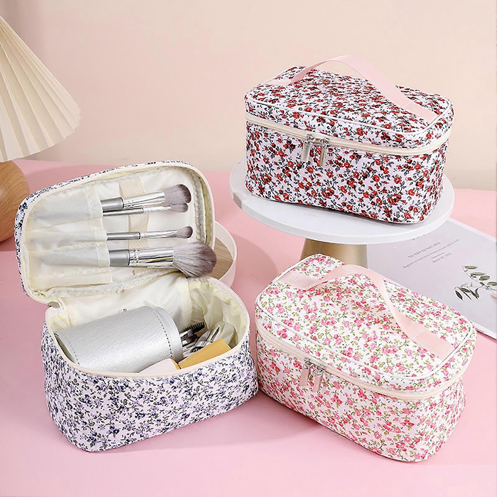 SUSUchens Cosmetic Bag Floral Pattern Large Capacity Dual Smooth Zipper Easy-to-clean Foldable Makeup Organizer Dark Pink