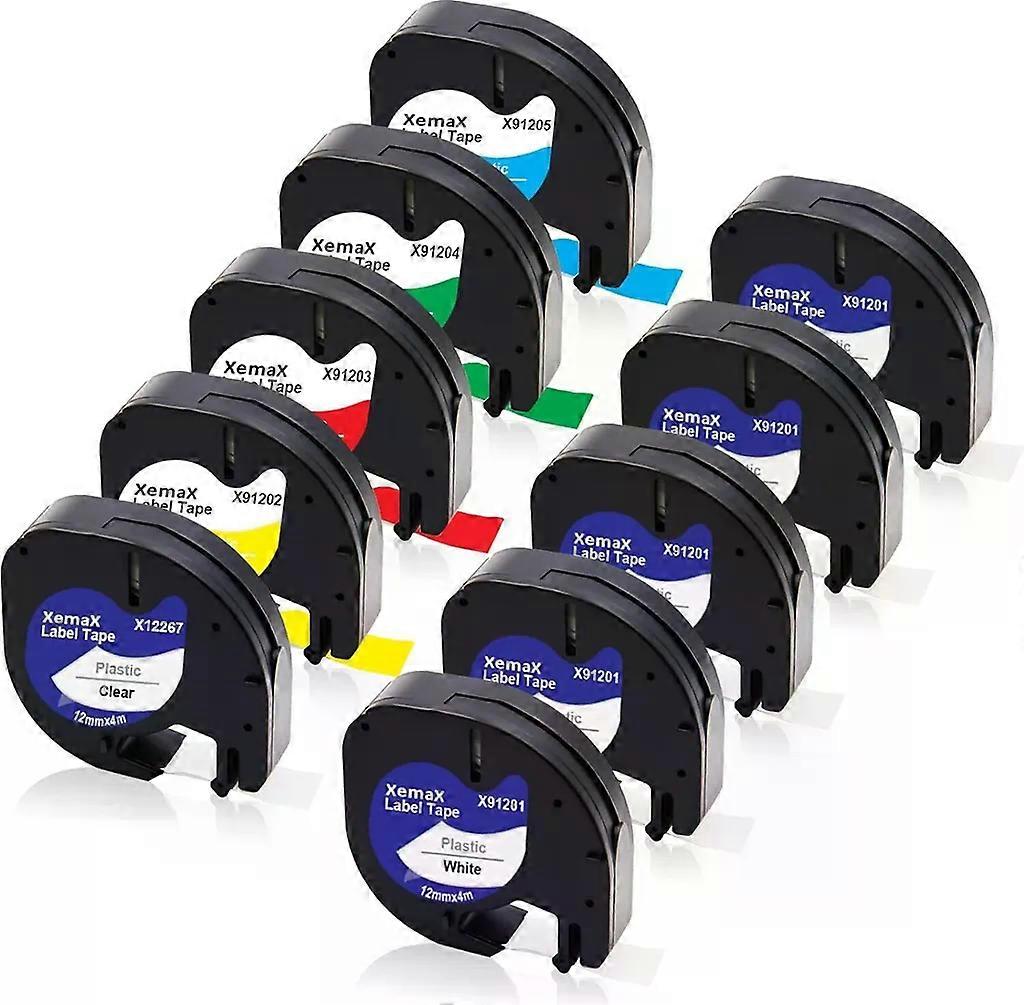 XemaX label tape 10x 12mm x 4m for Dymo LetraTag LT series, black on white & colored, waterproof, residue-free removal