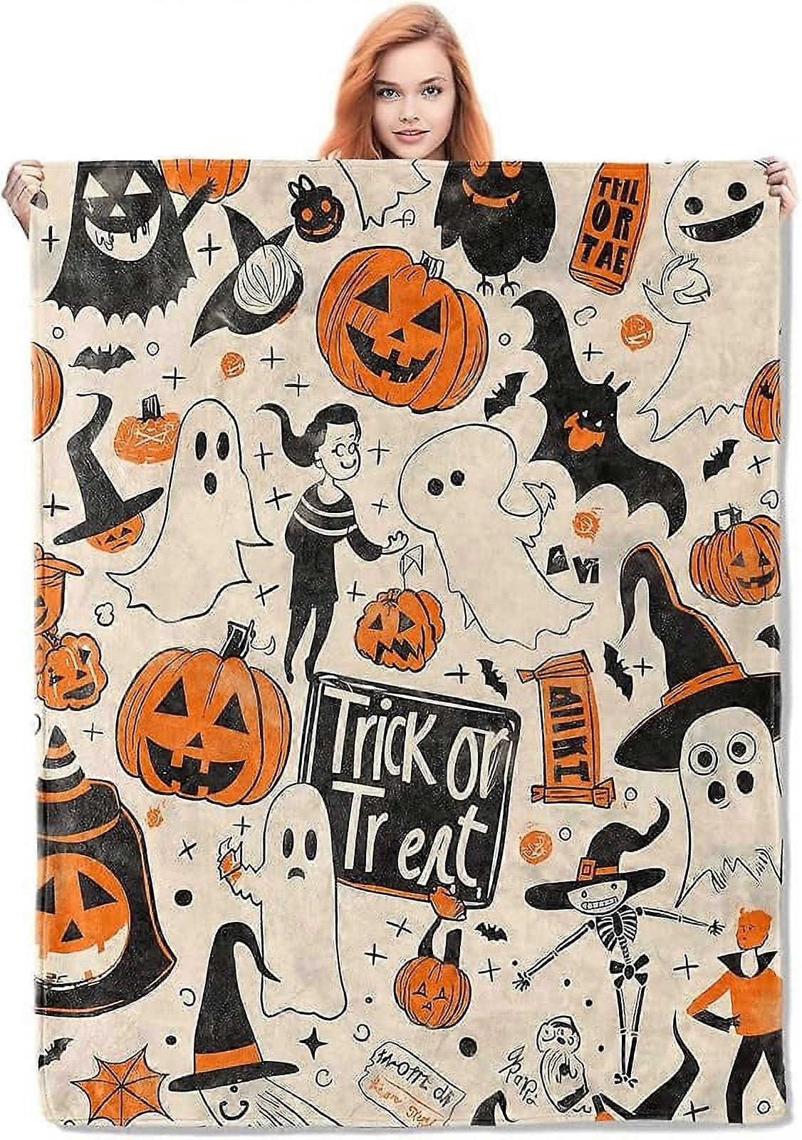 Trick or Treat Fleece Blanket Gifts, Playful Halloween Characters Design, Soft Halloween Throw, Whimsical October Decor - Orange and Black