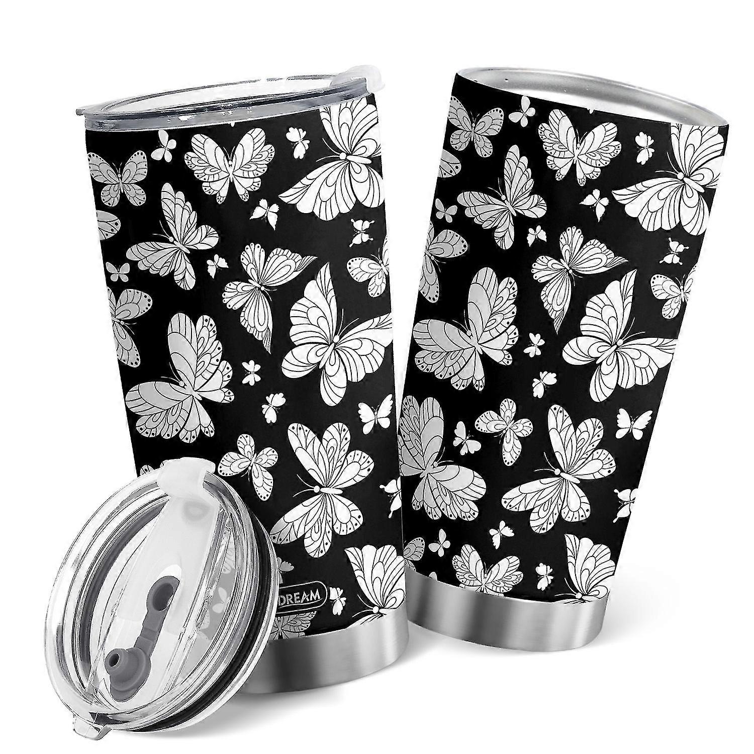 Oasisdream 20oz Butterfly Print Tumbler with Lid Double Wall Coffee Cup for Home Outdoor 25-26