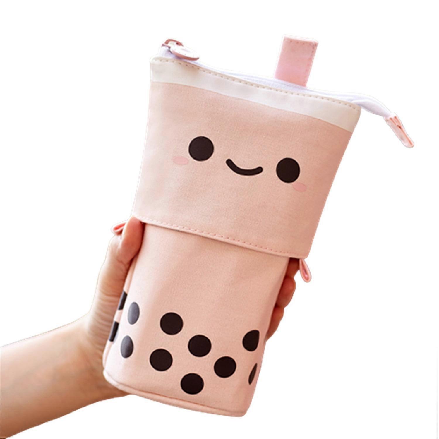 Canvas Retractable Pencil Bag Large Capacity Polka Dot Print Zip-up Pen Pouch with Multi-pockets Milk Tea Cup Shape Cosmetic Bag(Pink)