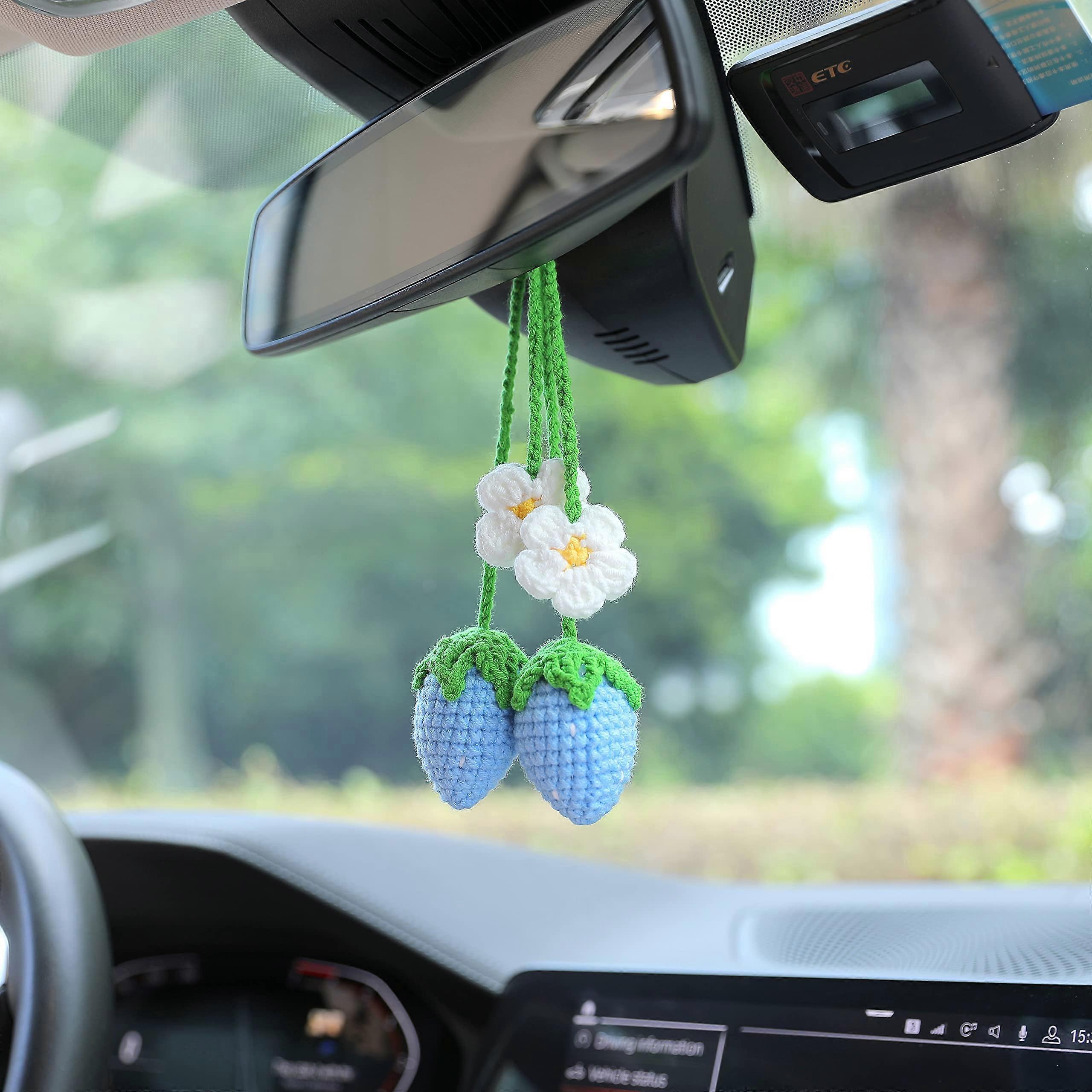 ZENGO Cute Crochet Strawberry Car Hanging Ornament for Car Rearview Mirrior Decor, Car Mirror Hanging Charms Accessories, Car Pendant Fruit (BLUE)