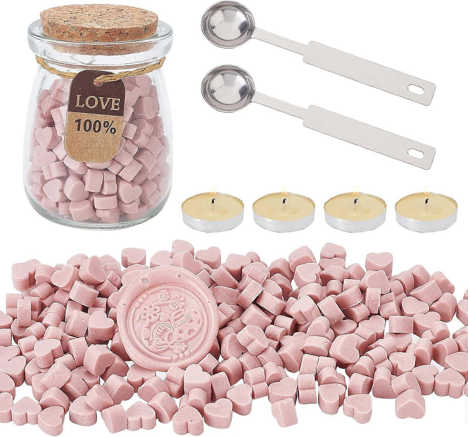 220PCS Heart Wax Seal Beads Kit Pink Sealing Wax Beads Packed in Glass Jar with 2PCS Stainless Steel Spoons and 4PCS Candles Envelopes