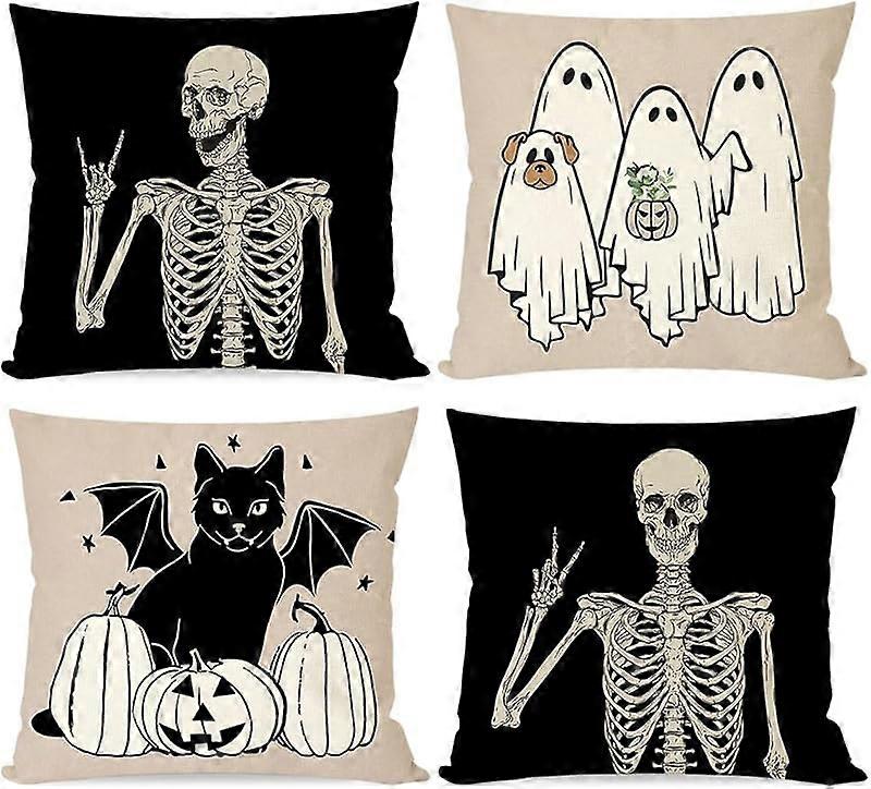 Halloween Pillow Covers 18x18 Set of 4 - Black Cat, Skeleton, Dog, Ghost, Pumpkin - Indoor Outdoor Decorative Throw Pillows Cases for Home, Bed,