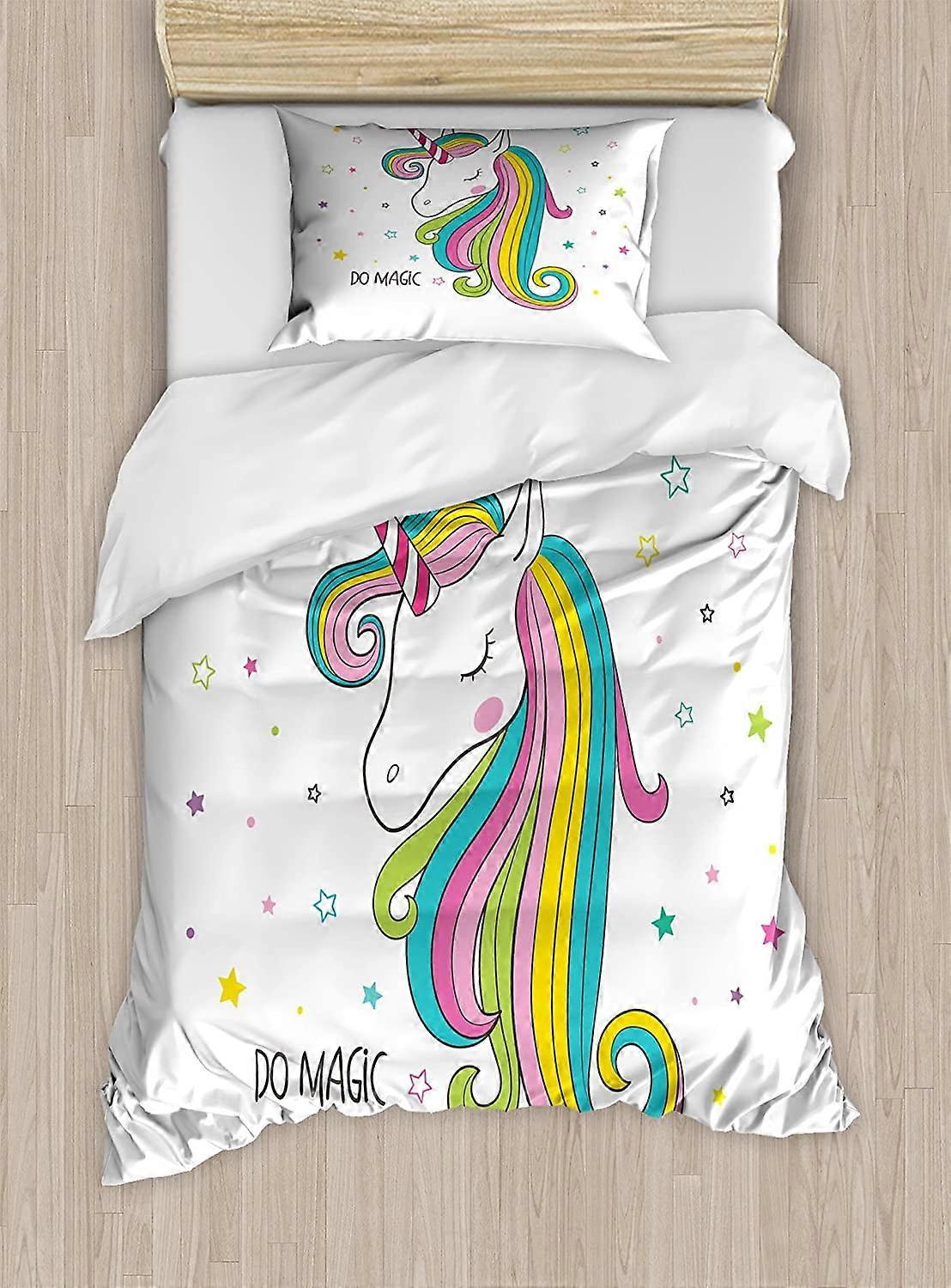 Unicorn Duvet Cover Set, Colorful Animal with Horn & Rainbow Mane on Starry Background, 3-Pc Pink White Bedding with 2 Pillowcases