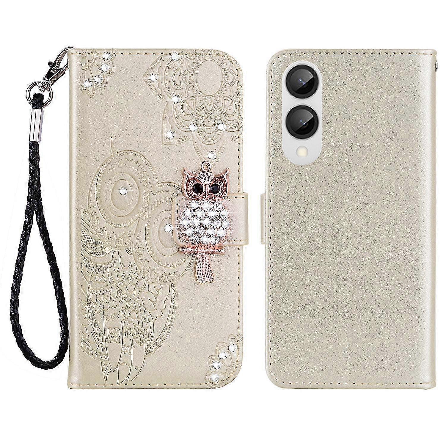 2025 For Samsung Galaxy S25 Edge Wallet Case Owl Flower Imprinted Rhinestone Leather Cover - Gold