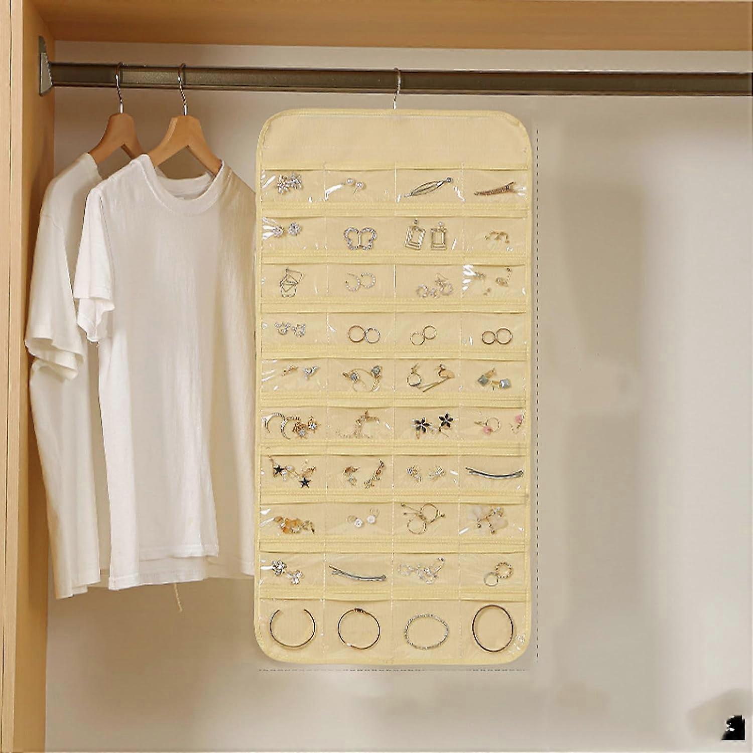 Item No. Jewelry Hanging Bag Color: Black White Beige Scope of Application: Underwear, Sundries Function: Multi-purpose Material: Non-woven Fabric Storage Scene: Bedroom Storage Hanging jewelry organizer with double zipper seal design Protects against dust Reduces air contact Quick access to jewelry Hangs in the wardrobe to save space It can be folded at will to prevent jewelry from slipping off while traveling 40 storage compartments on the front can be stored earrings jewelry hairpin 8 storage compartments on the reverse side can store necklaces, bracelets, watches Transparent PVC made of every easy stainless steel hook has a strong load-bearing capacity, suitable for hanging on the wardrobe door, and can be easily flipped in the closet while browsing this necklace storage bag is perfect for storing and displaying your different belongings