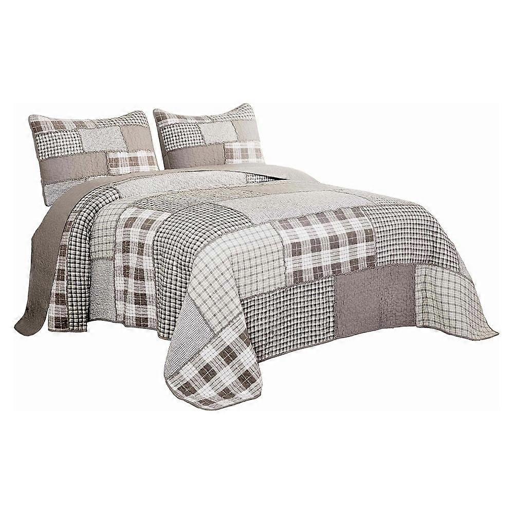 3-Piece Plaid Checkered Patchwork Striped Quilted Washed Cotton Reversible Bedspread Quilt Set, King, Beige