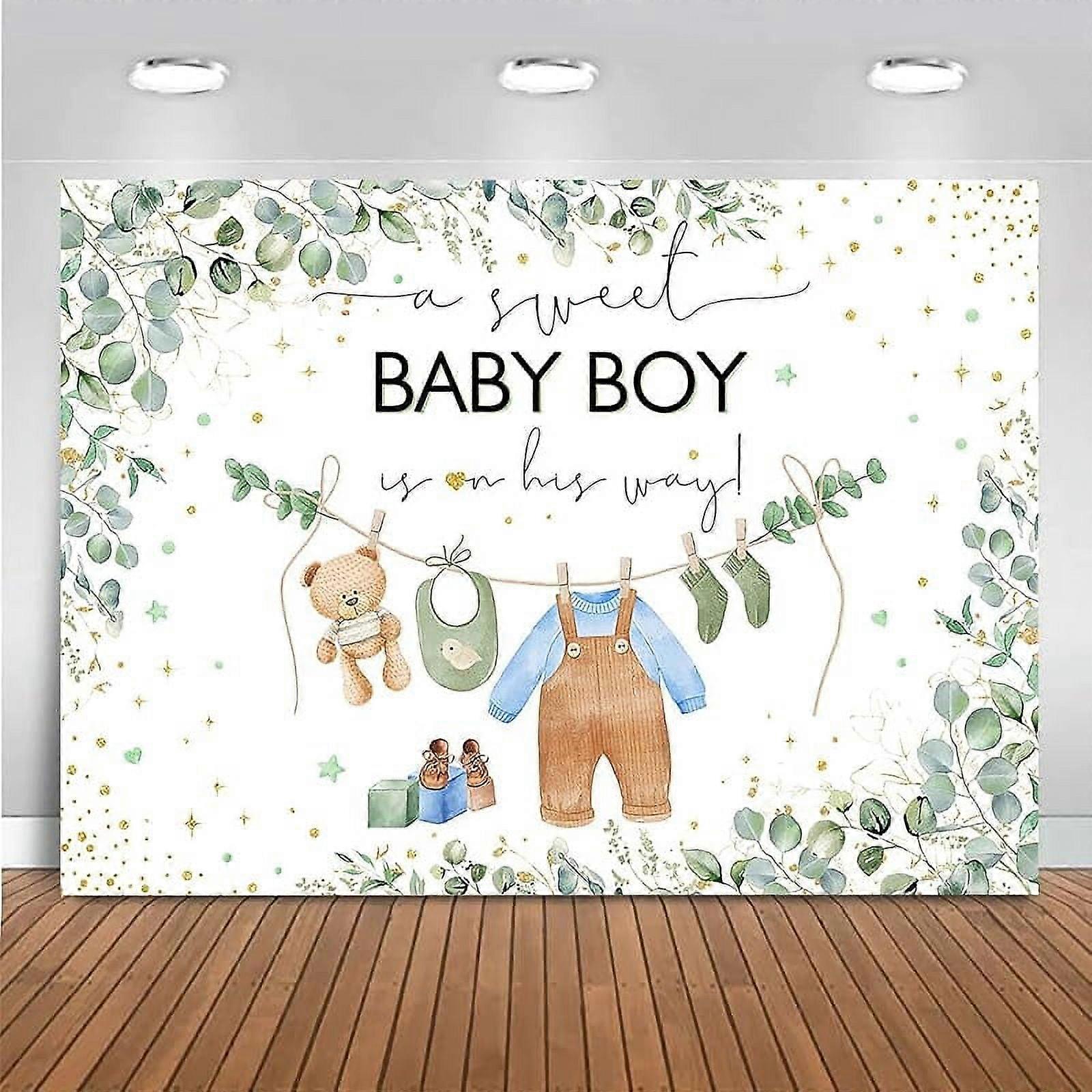 Baby Boy Backdrop for Baby Shower, Oh Baby! Green Leaves & Eucalyptus Floral Watercolor with Golden Dots, Cake Table Banner, Photo Booth Decor