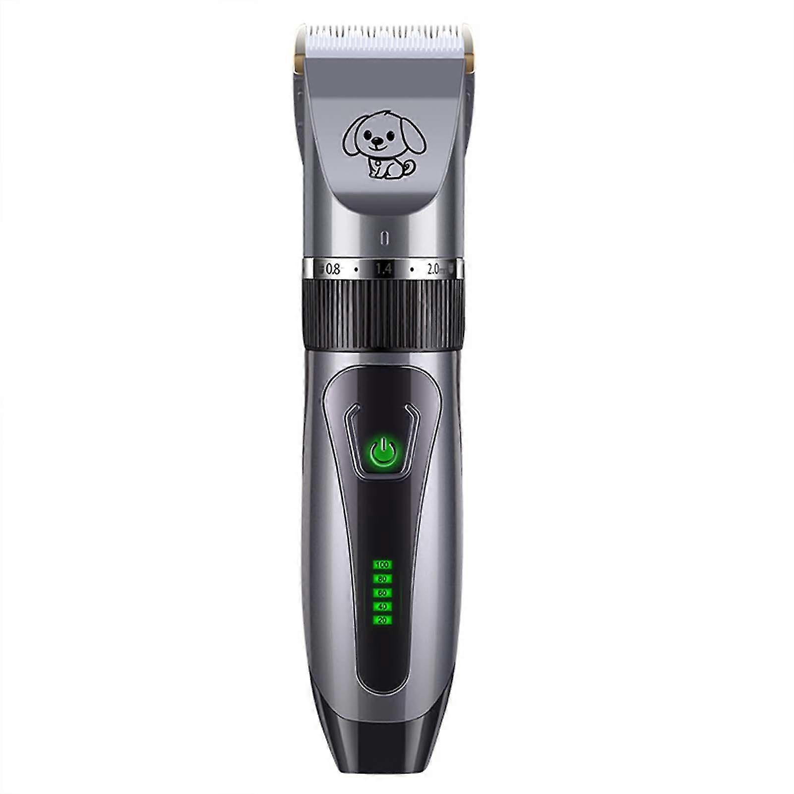 Features:1. The blade is sharp and not jammed, professional titanium ceramic sharp-angle blade, sharp and durable, no heat, and good cutting efficiency.2. Using a professional copper shaft motor, more powerful power, low noise design, to prevent pets from frightening, replaceable battery design, you can choose a spare battery to prevent halfway running out of power.3. R-shaped obtuse angle treatment of the head, contacting the cortex at all angles when starting up and running to prevent cutting the pet's skin.4. The fine adjustment of the 5-stage head makes it easier for you to shave short hair for your pet (adjustable 0.8-2mm). It can be used for charging and plugging, and it can be used at any time when plugged in; USB fast charging is more convenient.5. A 3-6-9-12mm limit comb is prepared for novices. Even if you have zero experience, you dont have to be afraid of mistakes. Set the limit comb. Your pet's hair is neatly shaved and will not be bumpy.Specifications:Color: Gold, rose gold, greyMaterial: ABSSize: 18.5*4.5cmRated voltage: 110V-240VRated frequency: 50Hz-60Hz Notes: 1. Due to the lighting effects and shooting angles, there is a color difference in the product, please understand. 2. Due to manual measurement, there is a tolerance in the product size. 1pc * Pet scissor 1pc * Nail clipper 1pc * Nail file 1pc * Comb 1pc * USB charging cable 1pc * Cleaning brush 1pc *Lube 1pc * English manual 1 set *Limit comb (include 4pcs, 3mm, 6mm, 9mm, 12mm comb) Note: Due to the light and screen setting difference, the item's color may be slightly different from the pictures. Please allow slight dimension difference due to different manual measurement.