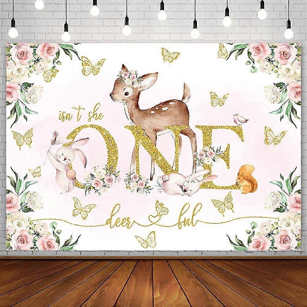 Deer 1st Birthday Backdrop for Girl, Pink Floral Gold Butterfly Bunny Isn't She One-Deer-ful Banner, Sweet One Princess Party Decor
