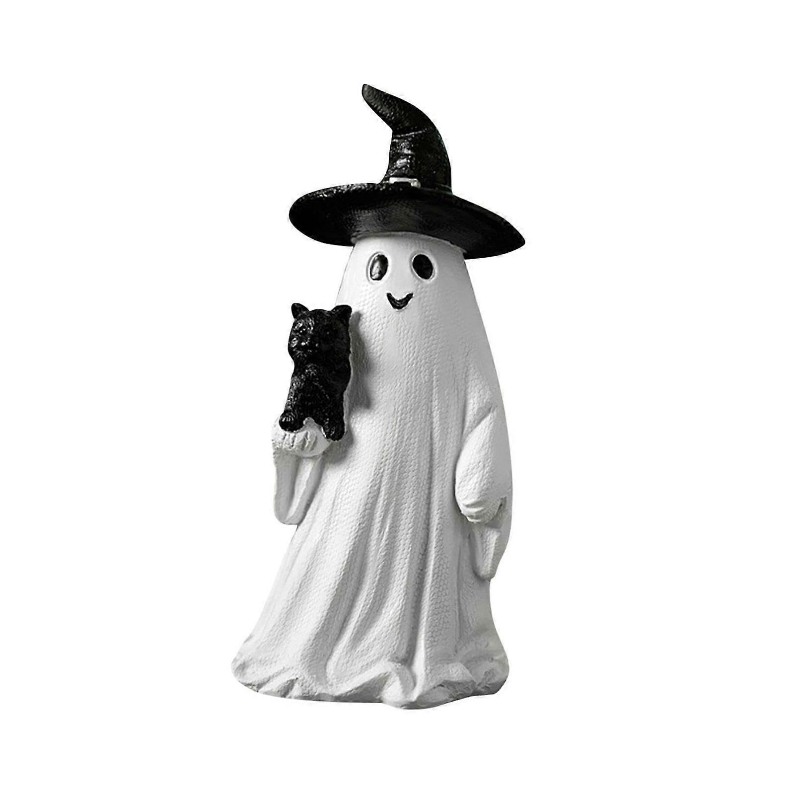 Halloween Ghost Figurine White Ghost Holding Pumpkin Cat Spooky Resin Ornament Engraved Halloween Decoration