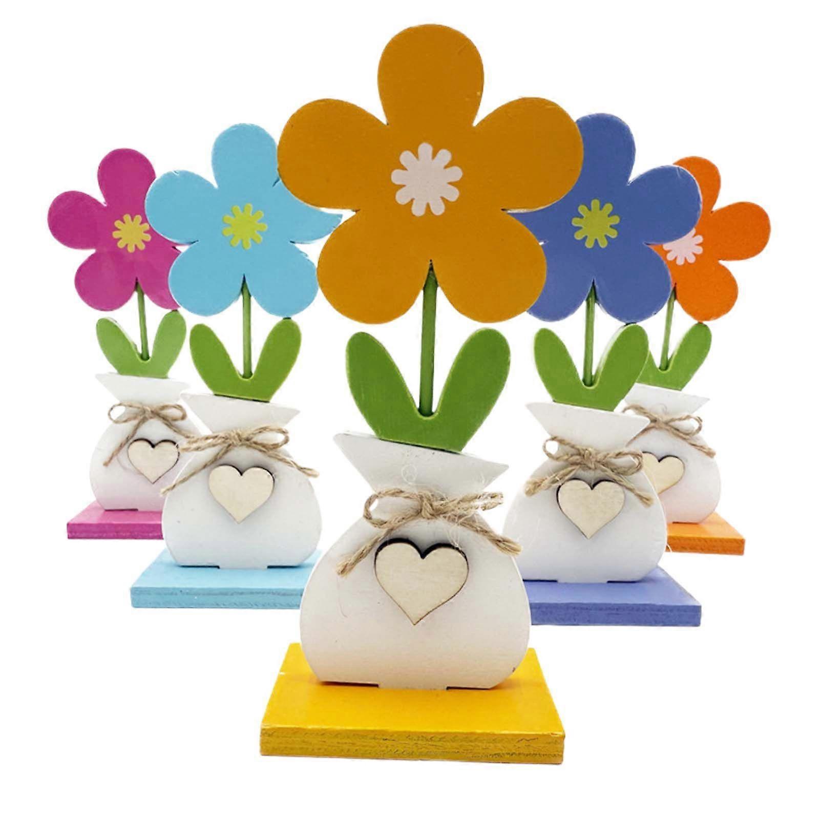 5Pcs/Set Wooden Flower Ornament with Base Boho Farmhouse Rustic 3D Colorful Flower Wood Table Sign Centerpiece Home Office Desktop Decoration